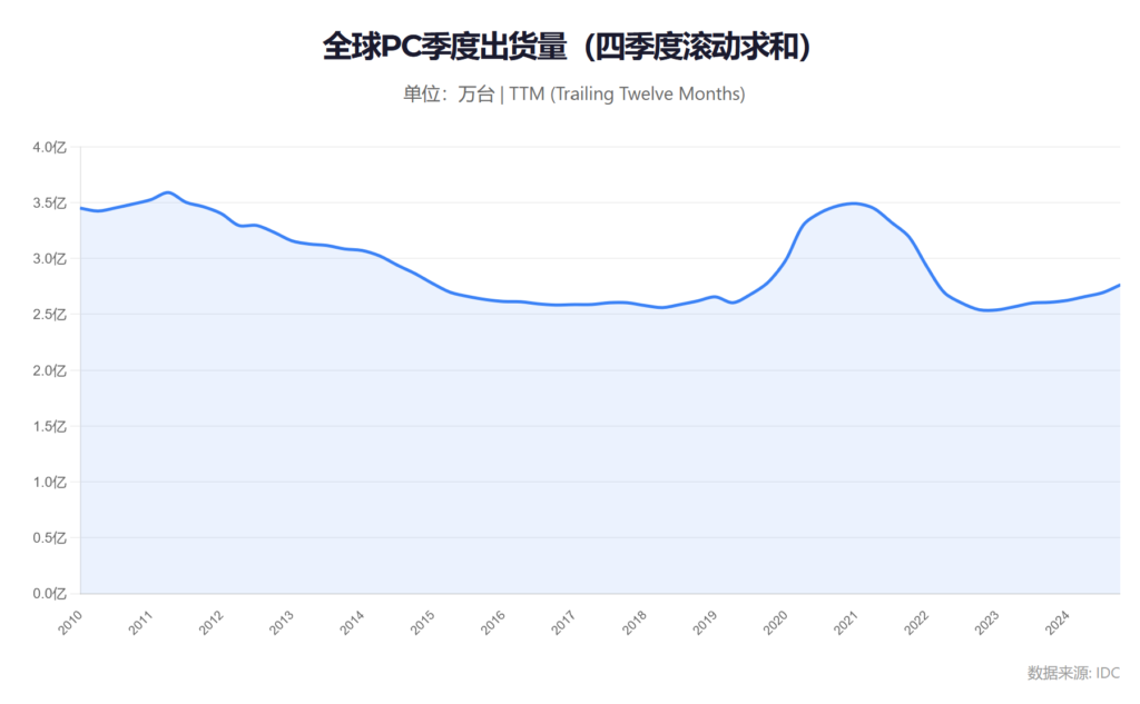 如果你看一下过去10年时间的个人电脑出货量曲线,从2010年开始下跌,一直跌到2018年。好不容易2020-2021年有点起色,但随着在线办公需求减退,人们回归线下生活,销量又跌回去了。