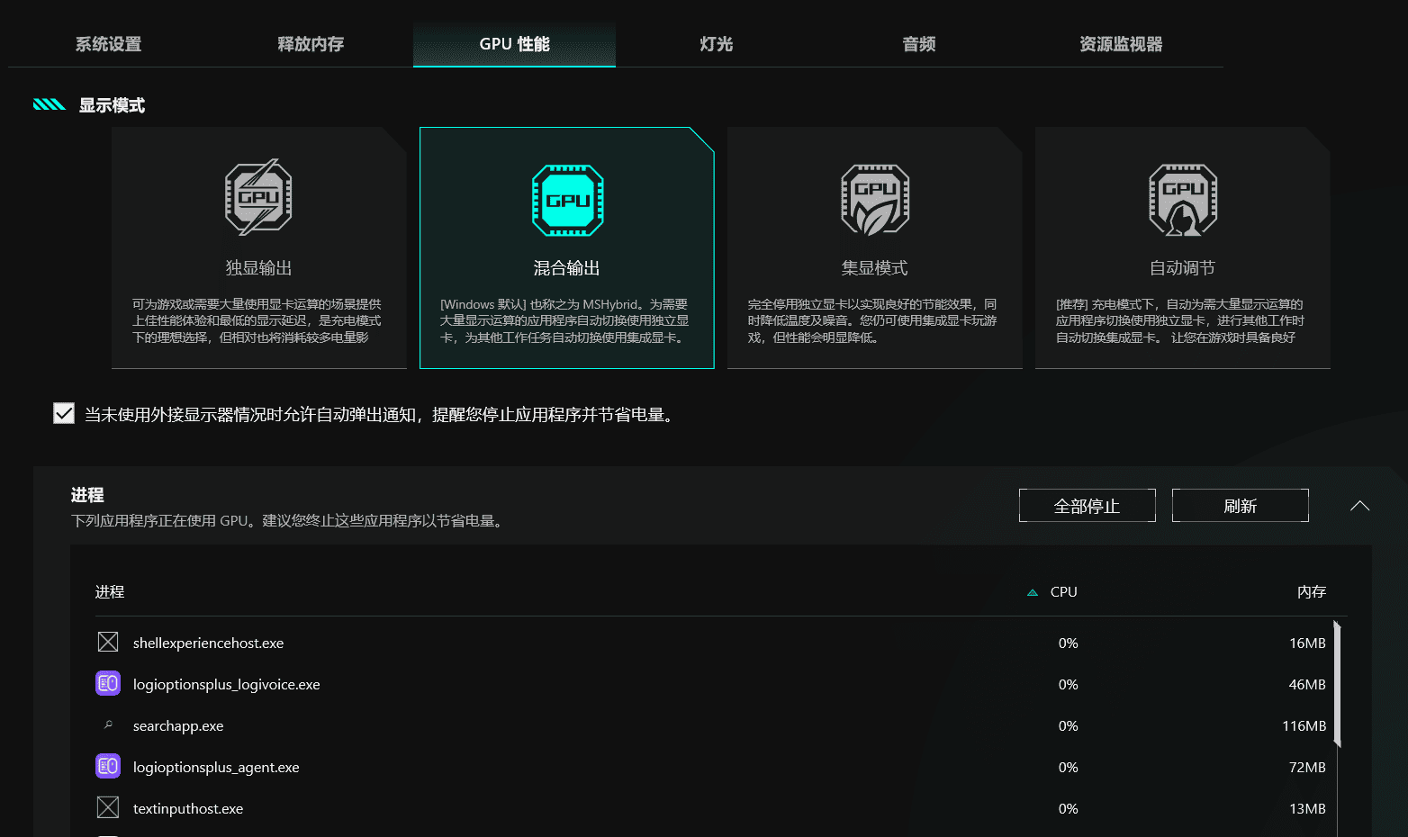 此外天选游戏本自带的奥创中心控制台,能够支持 “双显三模”,可以允许只开启核显模式,从而大幅降低独立显卡 GPU 负载电耗,再加上 90Wh 的大电池,即使是你没有地方充电,它也能足够支撑住小半天的连续轻度办公和学习。