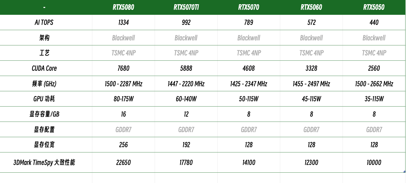 RTX 5070的显存容量,显存带宽和满血功耗都是和 5060 一样的,在 40 – 115W 区间都会比 5060 的性能跑分高一截。