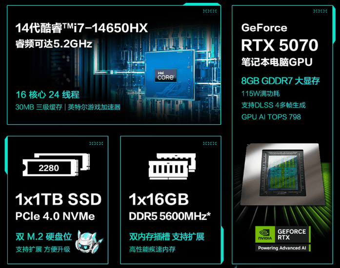 除了 5060 的这两款,还有一款配置是相当有趣:i7-14650HX + RTX 5070 配置。
