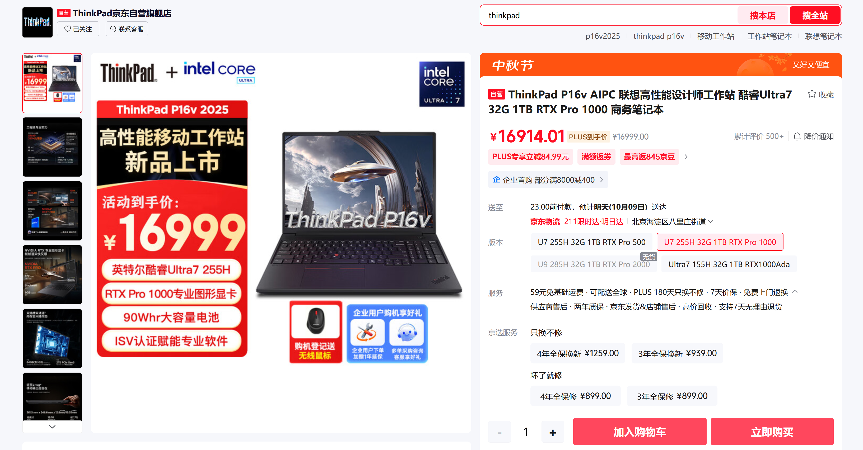 ThinkPad P16v有着相似的配置,同样是英特尔酷睿Ultra 7 255H、32G内存、1T固态,屏幕为1080P,电池容量90Wh。可以点击这里购买。