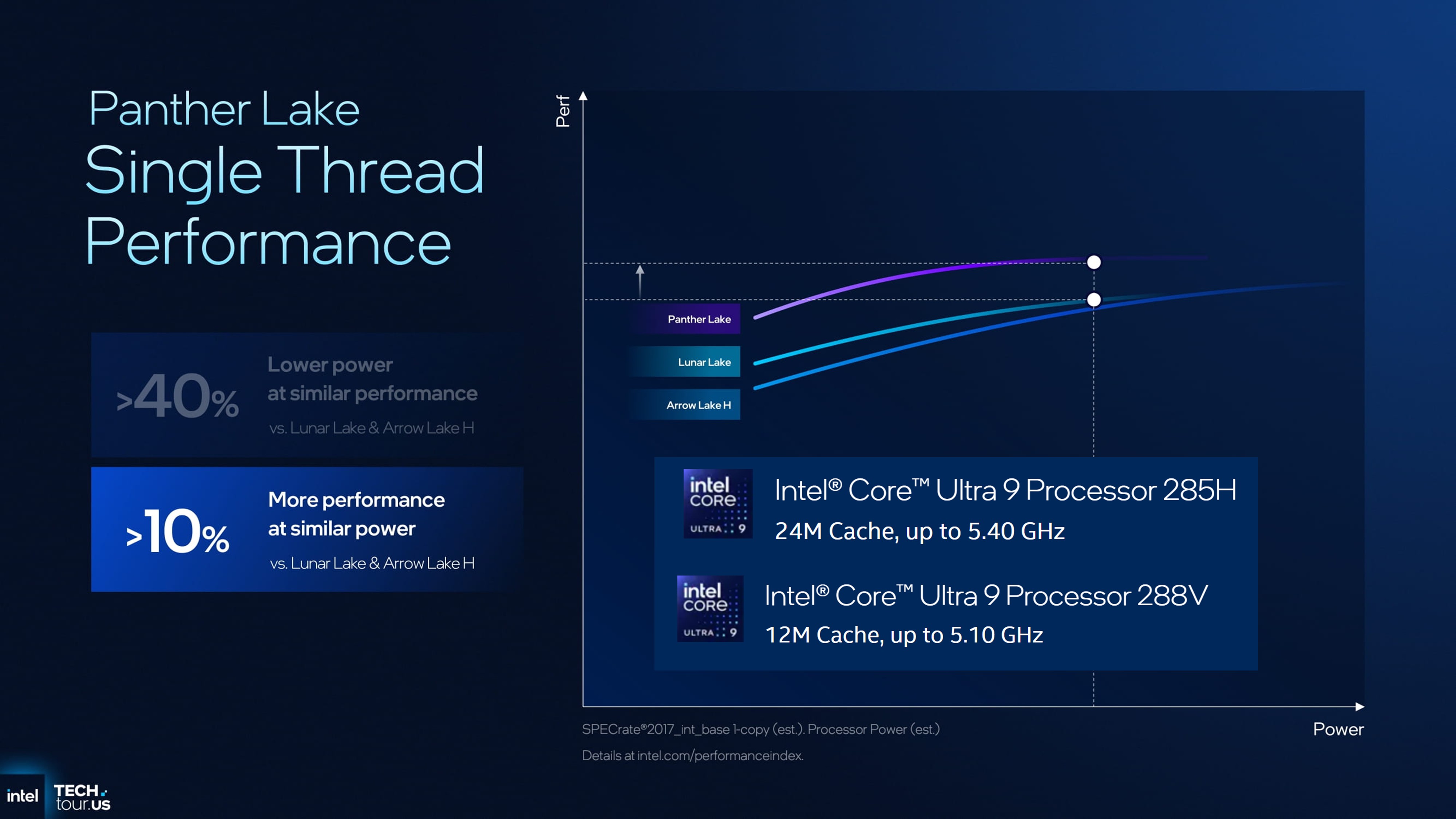 当将其与 Arrow Lake 比较时,英特尔指出 在相同性能水平下,功耗降低约 30%。整体而言,Panther Lake 的 CPU,在单核与多核方面都不应期望过高,其优势主要体现在 能效优化 而非绝对性能。