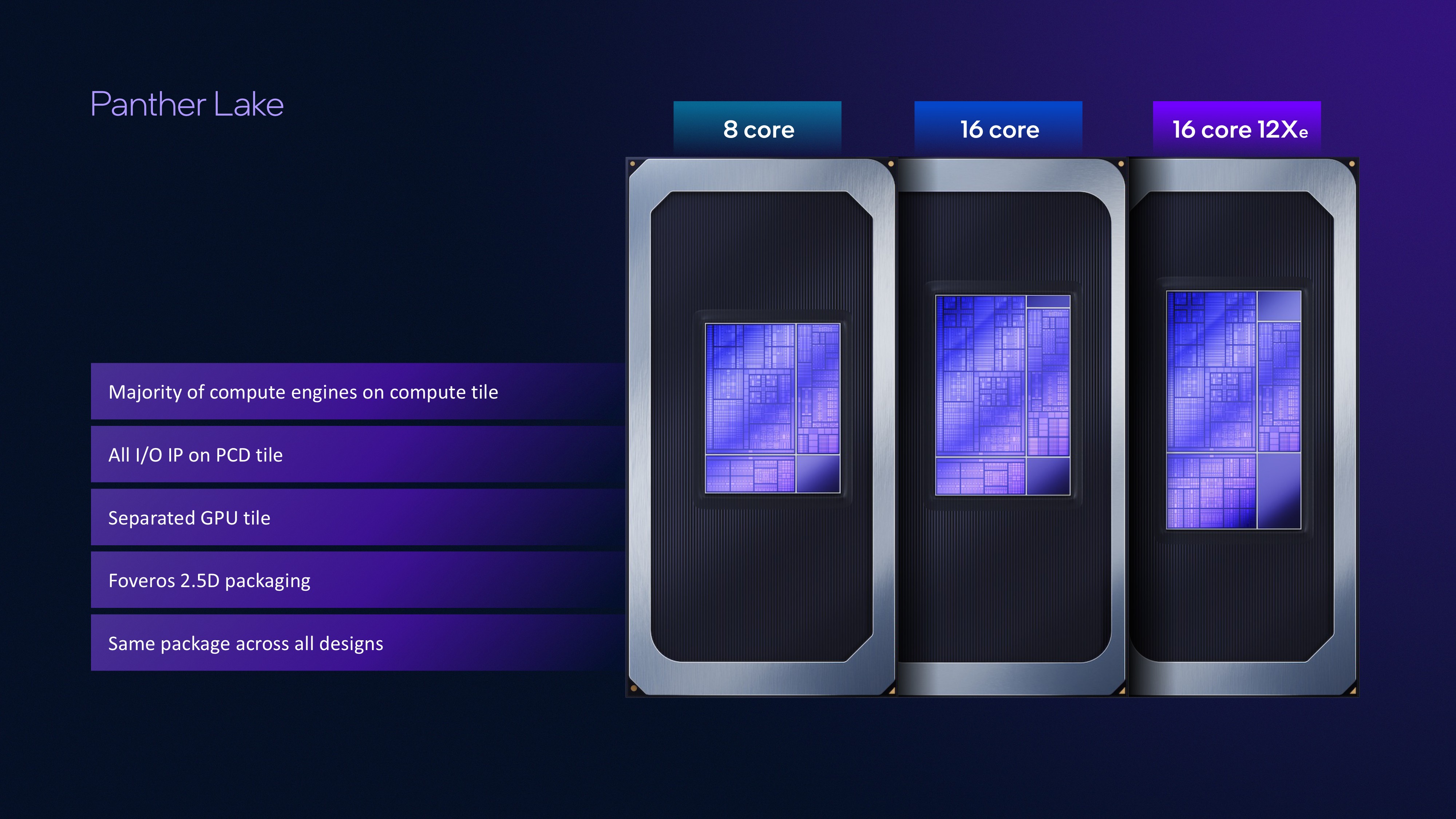 英特尔特别强调,Panther Lake 各型号在物理封装上 实现了统一(Same Package Across All Designs)。