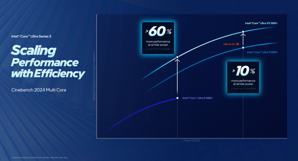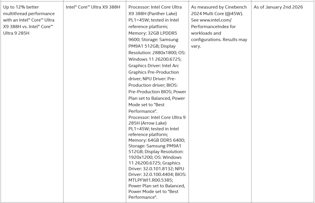 英特尔在后面的注释里面披露了Ultra X9 388H多核性能比Ultra 9 285H提升10%,是在45W口径下跑到的。如果在拉满到80W的情况之下,酷睿Ultra X9 388H相比于Ultra 9 285H在Cinebench R23这类常用跑分下并无提升。