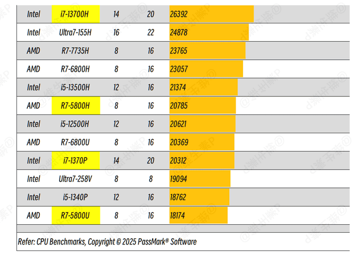 i7-13700H 多线程性能比 6800H 好一截,功耗给高一点,i5-13500H 都能和 R7-6800H 打得有来有回。