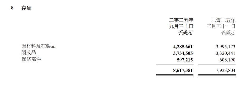 笔记本电脑评测网查询财报数据显示,截止2025年9月30日,联想存货为86亿美元,其中原材料和在制品42亿美元。去年同期2024年9月30日,存货为91亿美元,其中原材料和在制品为50.9亿美元。