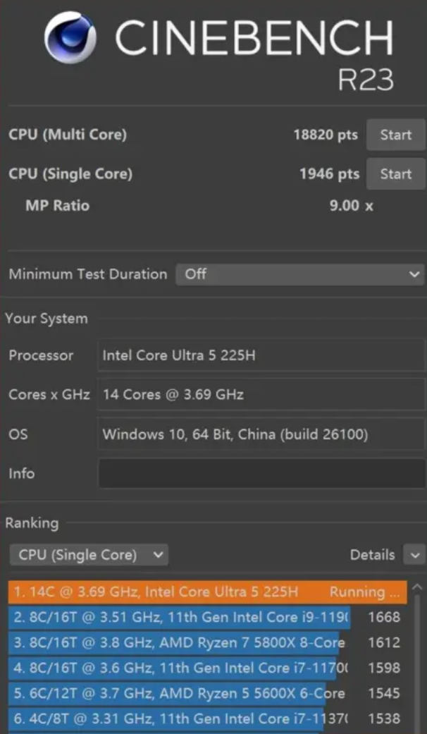 值得注意的是,根据路透社报道,这些比较是相对于Lunar Lake的。而Lunar Lake专为低功耗设计,多核性能较为孱弱。笔者通过查询数据库可知,Luanr Lake在Cinebench R23当中得分约为10000出头。提升50%的CPU多核性能为15000。作为对比酷睿Ultra 5 225H可以达到18000分。尚不清楚这一得分如何对比得出。