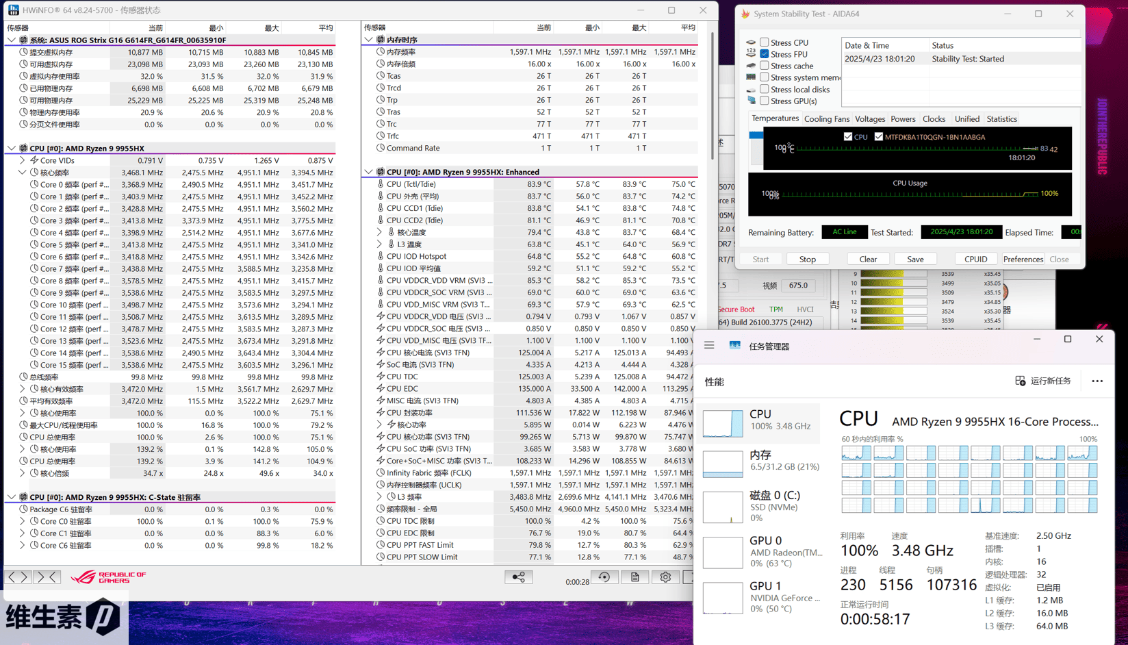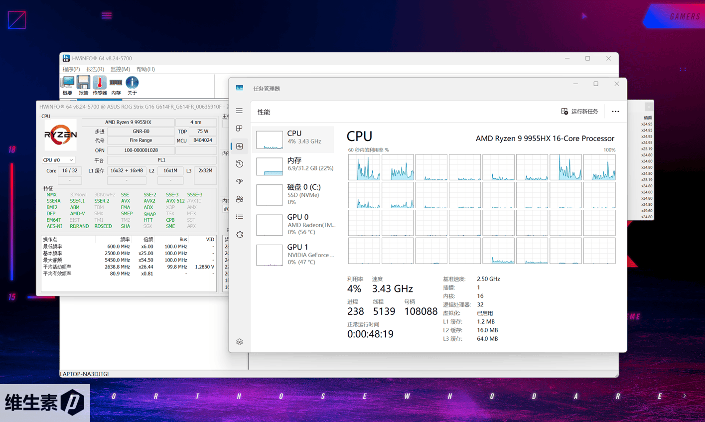 ROG 魔霸 9 的 CPU 是来自 AMD 的 R9 9955HX,Zen5 架构,16核心32线程,代号 Fire Range.