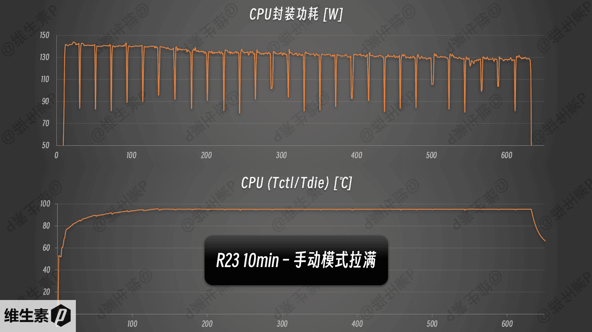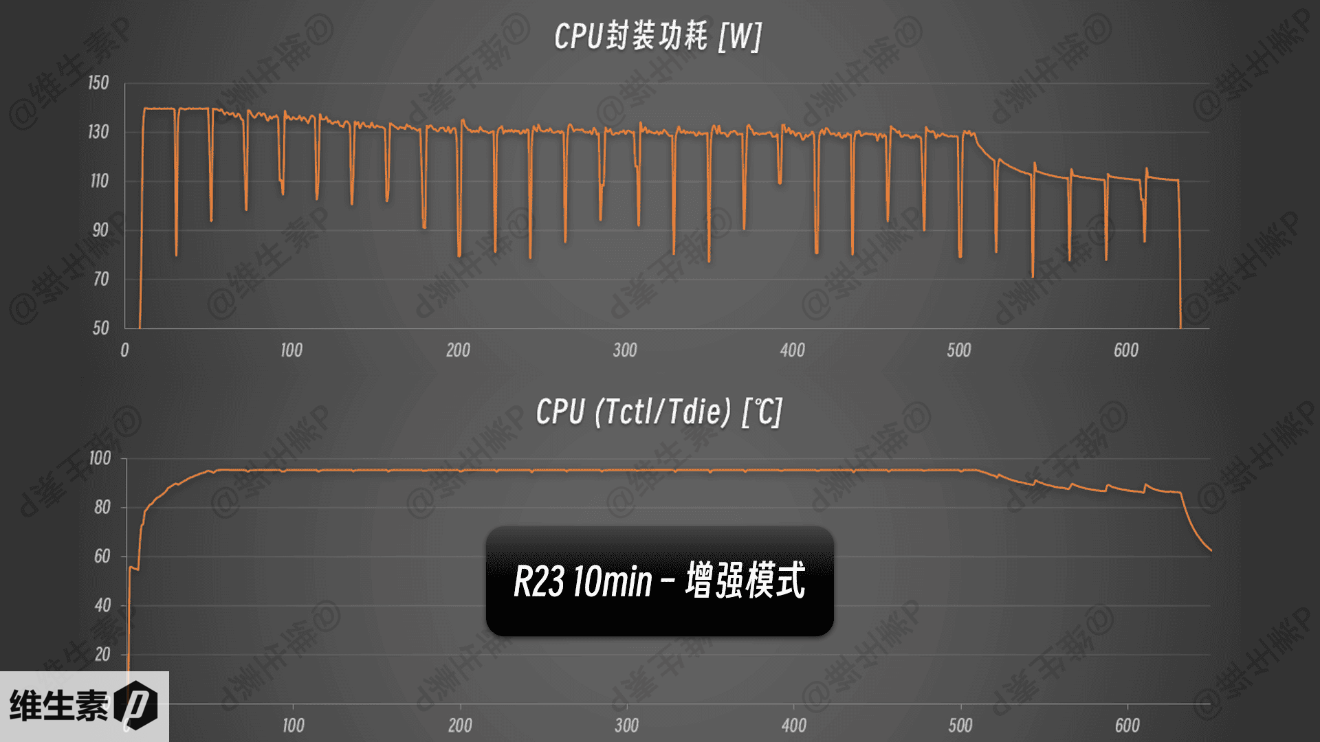 ROG 魔霸 9 的 R9 9955HX ,在 R23 的 10分钟测试中,CPU 的功耗表现如下,最开始可以达到 140 W,跑完两轮之后,开始逐渐下降,最后数轮功耗在 110 W,CPU 温度在 95 – 86 度之间。