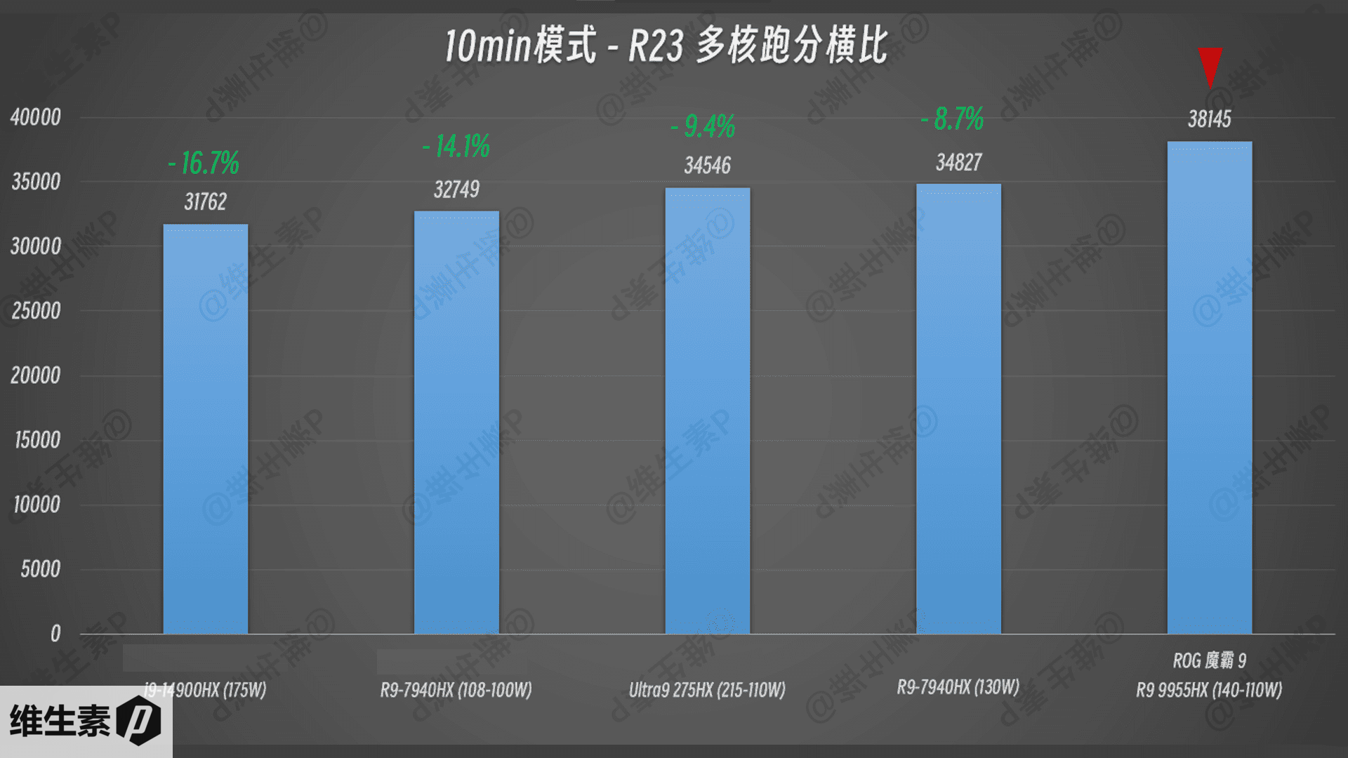 单核性能横比来说比上一代的 7940HX 有一定幅度的提高,多线程性能更是拔得头筹,和上一代的 HX 处理器性能明显拉开身位,而且功耗其实也还好。