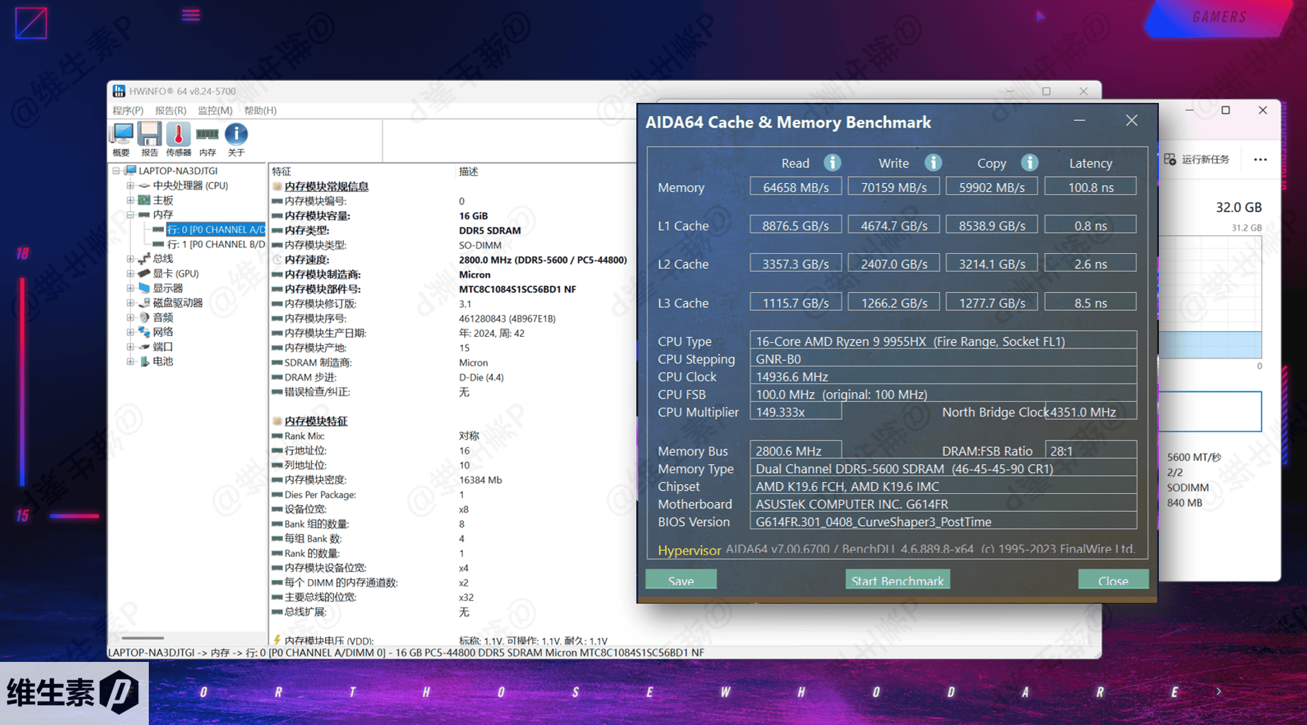 ROG 魔霸 9 的 内存是 DDR5 5600MT/s 的插槽内存,默认配置是一根 16G 内存,而且是 8 Bank Group 高性能版,这里再加装了一根 16G,组成了 32 G,内存制造商为美光,读写速度如下所示。