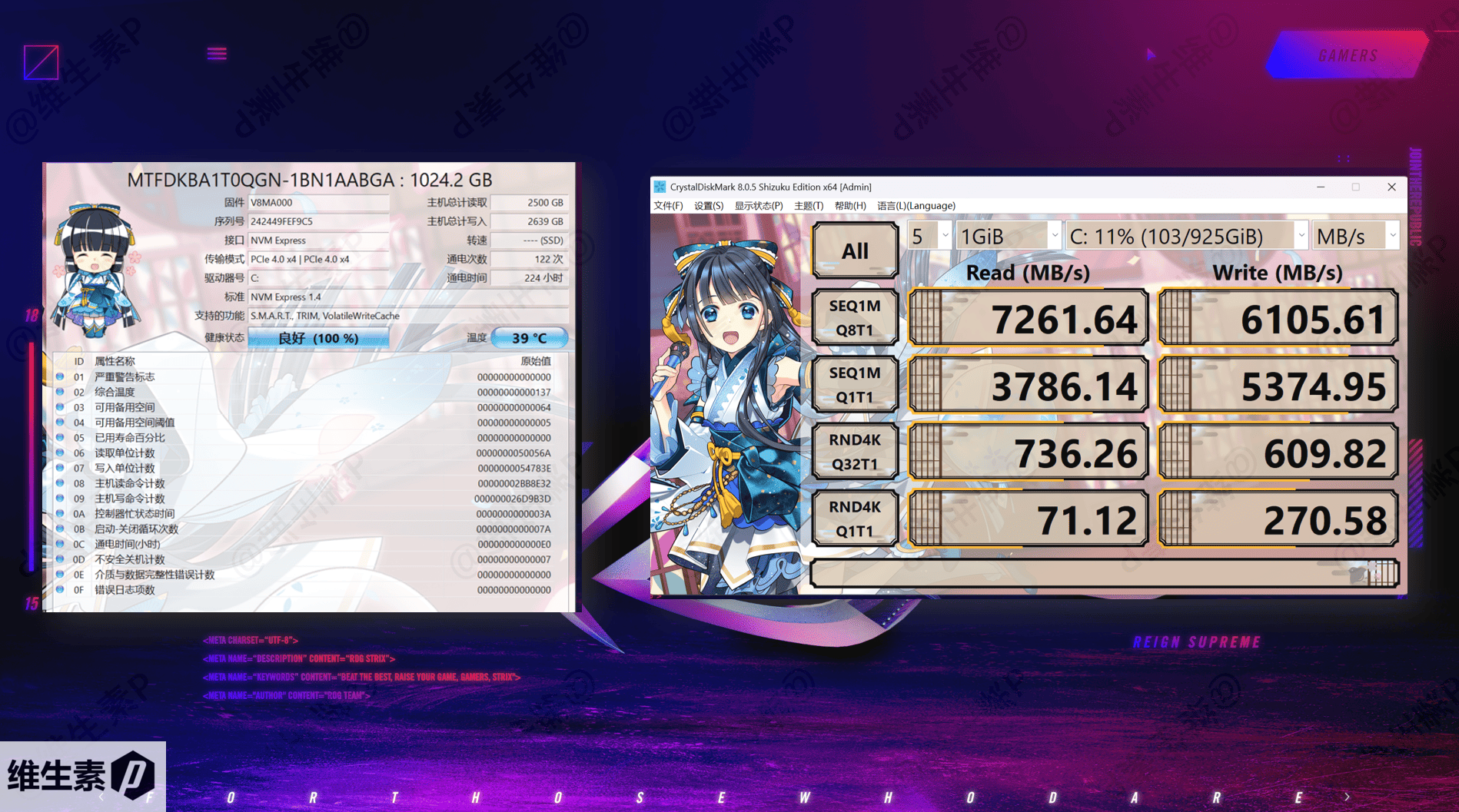 ROG 魔霸 9 工程机硬盘来自美光,零售版计划可能是使用海力士,默认配的是一块 M.2 2280 常规的 NVMe PCIe 4.0 固态硬盘 ,工程机硬盘读写速度如下所示: