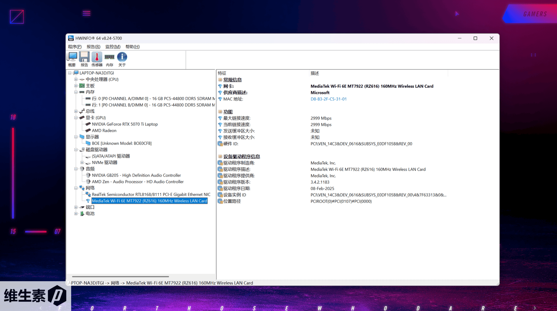 ROG 魔霸 9 的无线网卡是 MT7922(RZ616),支持 Wi-Fi 6E ,是 AMD 和联发科联合开发的网卡,多见于锐龙处理器的笔记本电脑。
