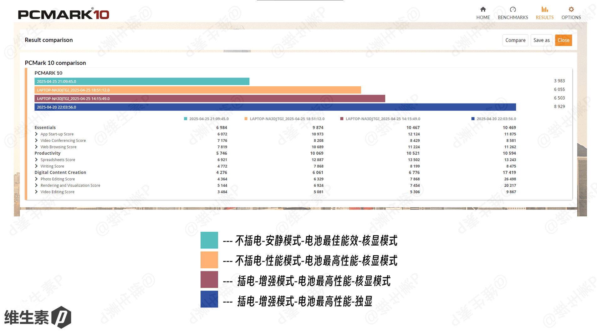 进行办公生产力方面测试,开启电源最高性能模式,垫高机身,选取了几种不同的模式进行测试。