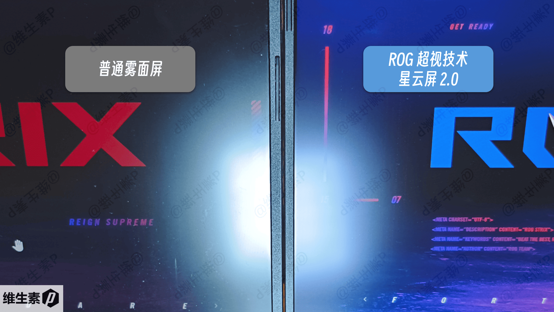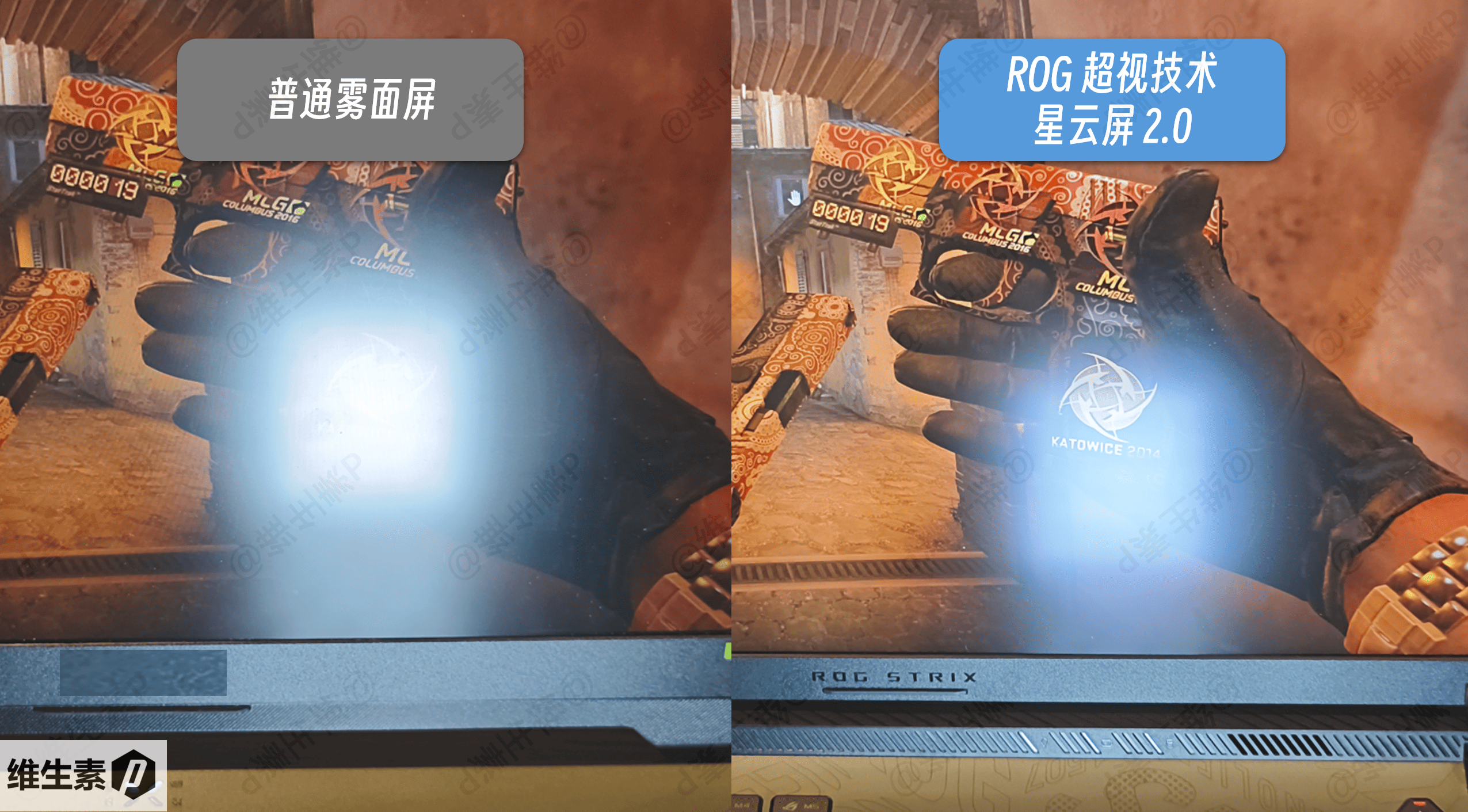 而即使是近距离有强光直射的情况下,ROG 超视技术通过减少 55% 光反射,可以依旧看出原画面的基本图案,相比之下普通的雾面屏已经完全看不清楚了。
