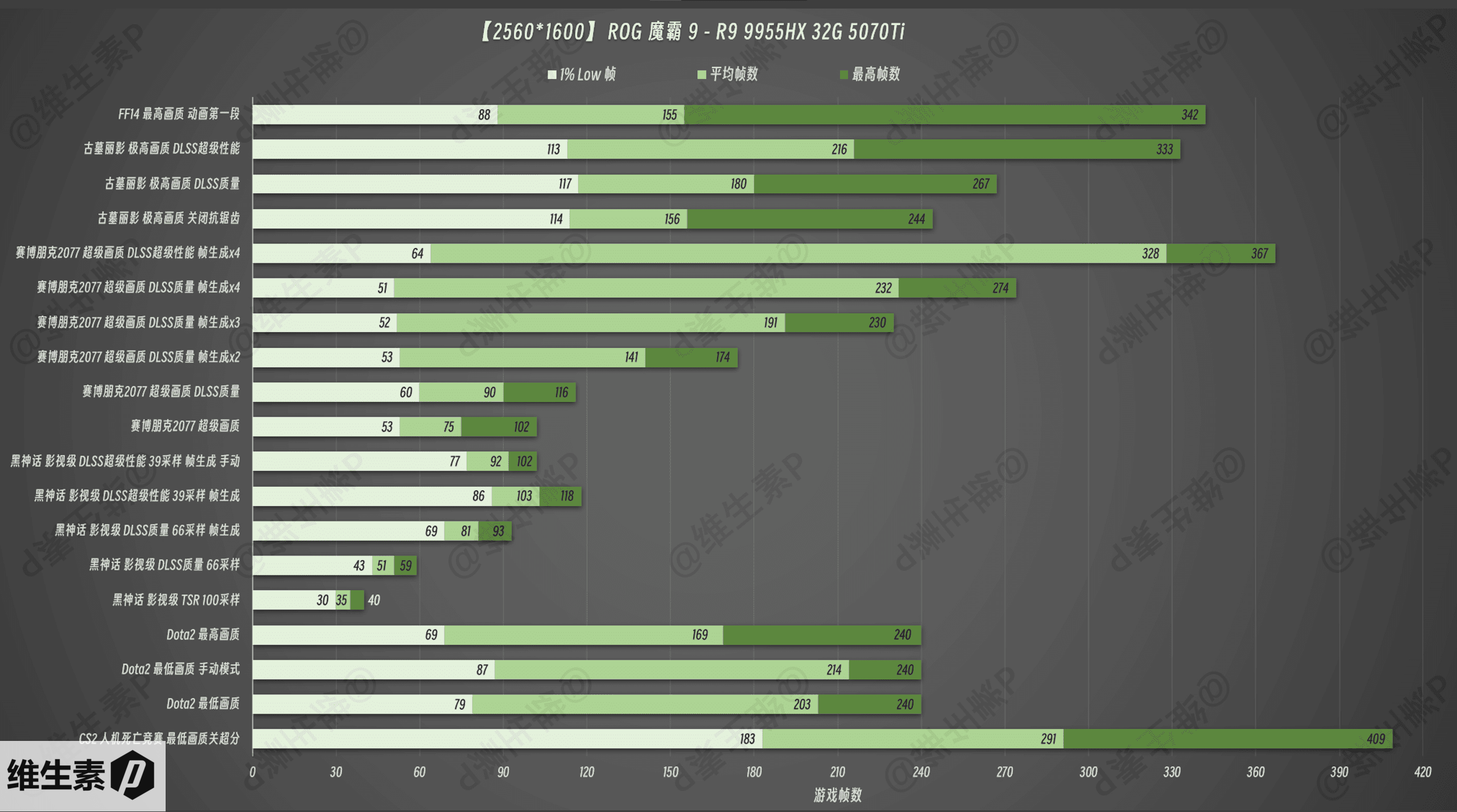 2.5K 分辨率下的游戏表现依旧给力,网游显然是毫无压力,9955HX 的三缓也足以满足绝大多数普通人的游戏极致诉求。大作方面,纯硬件算力也能够勉强达到可玩级别,但是也不怕,N卡 直接 DLSS 原地启动,就是上升到另一个层级的舒适体验。