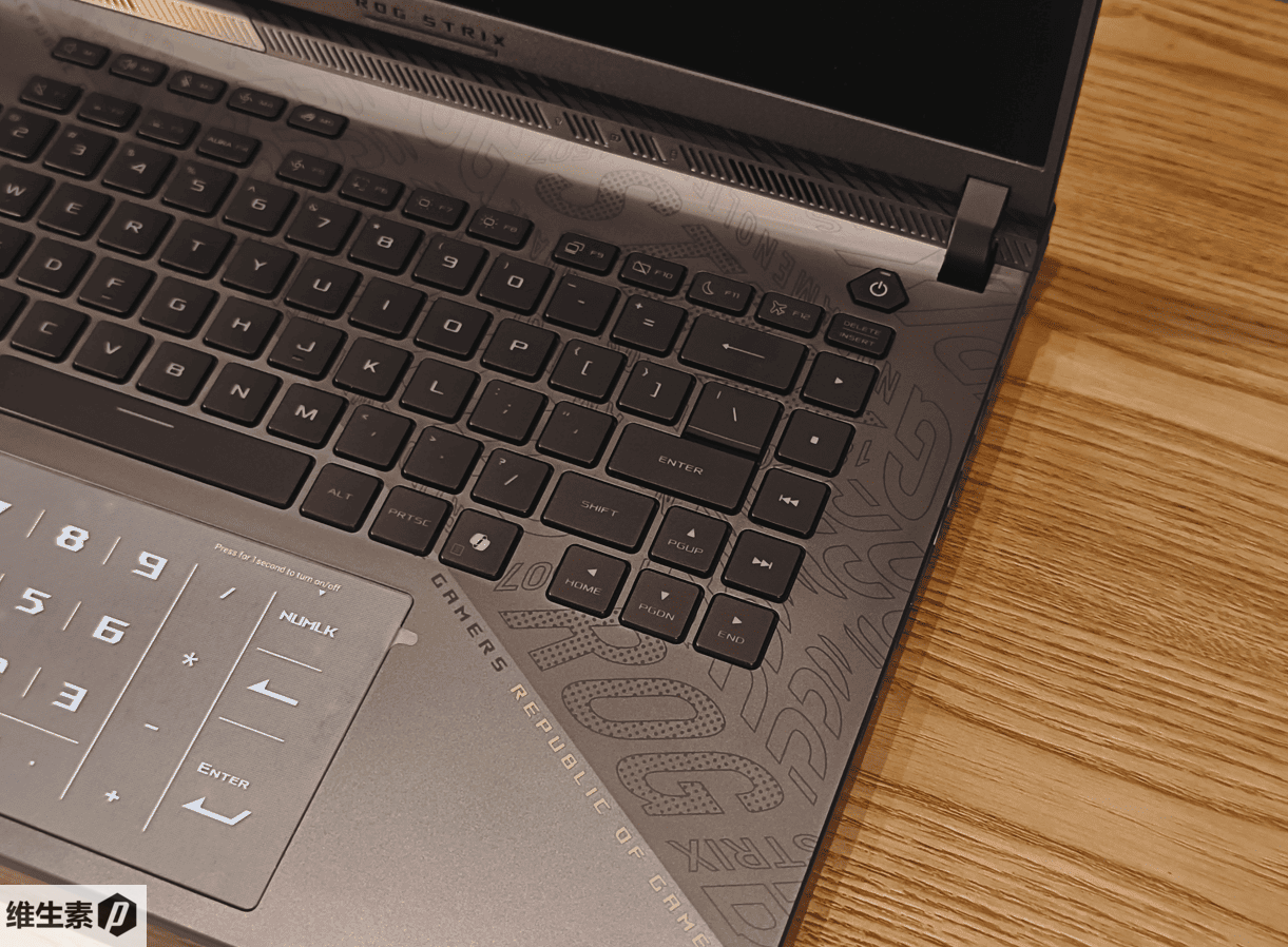 小数字键盘则是挪到了触控板位置,而且触摸板的面积也相较于上一代有增大。小数字区可以通过长按 NUMLK 区域唤起灯光实现点按。上面覆盖的贴纸对触摸板手感影响很小,不过你也可以拿掉。