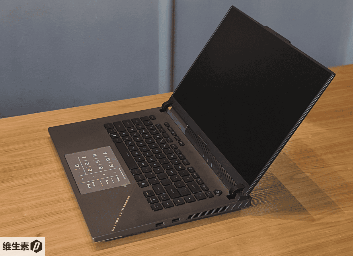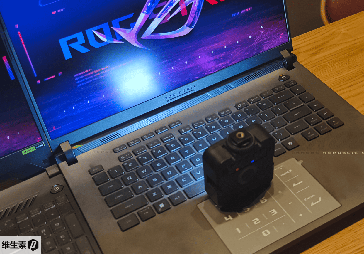 ROG 魔霸 9 顶部有一个小小额头,可以方便单手开合,左右窄边框,屏幕转轴也比上一代微微减小了一些。靠近掌托的一侧有 U 形环绕的 RGB 灯带,同样也支持神光同步。