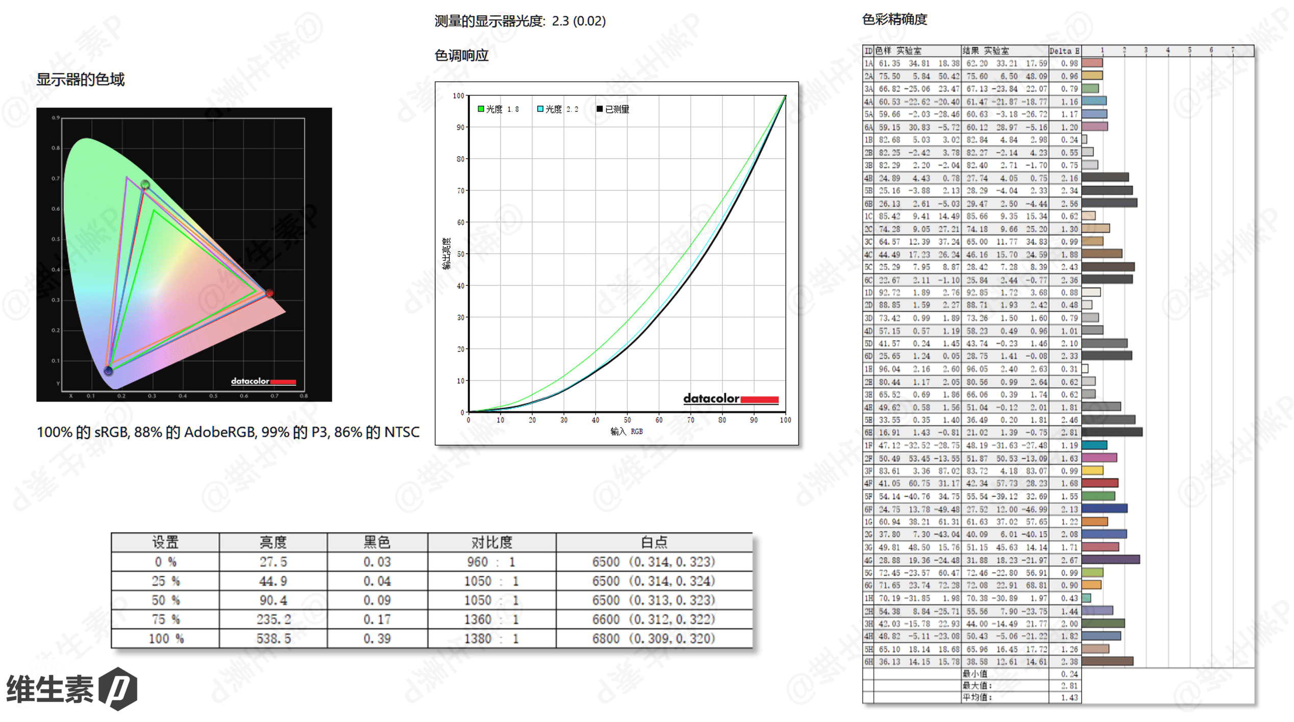 使用相关仪器测量,实测覆盖色域 100 %sRGB,也有 99% P3 色域,色调响应 2.3,最大亮度 538 nit,色准平均 Delta E 为 1.43。