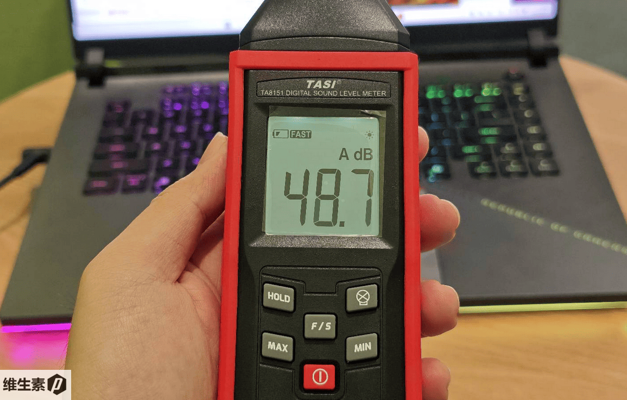 增强模式下的极端负载人位噪音为 48.7 分贝左右,没有高频尖锐声,这个噪音在游戏本里表现还不错,如果是打网游的话一般显卡跑不满,显卡一般是占 55-110W,风噪还会更低一点。