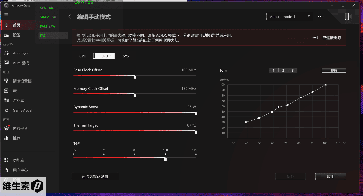 ROG 控制台内可以自己额外调整风扇曲线和自定义功耗,并且可以自定义显卡超频。由于超频需要具体抽手气看体质,所以这里就不多赘述了,发烧友们都明白的。如果不明白,不建议乱调整。