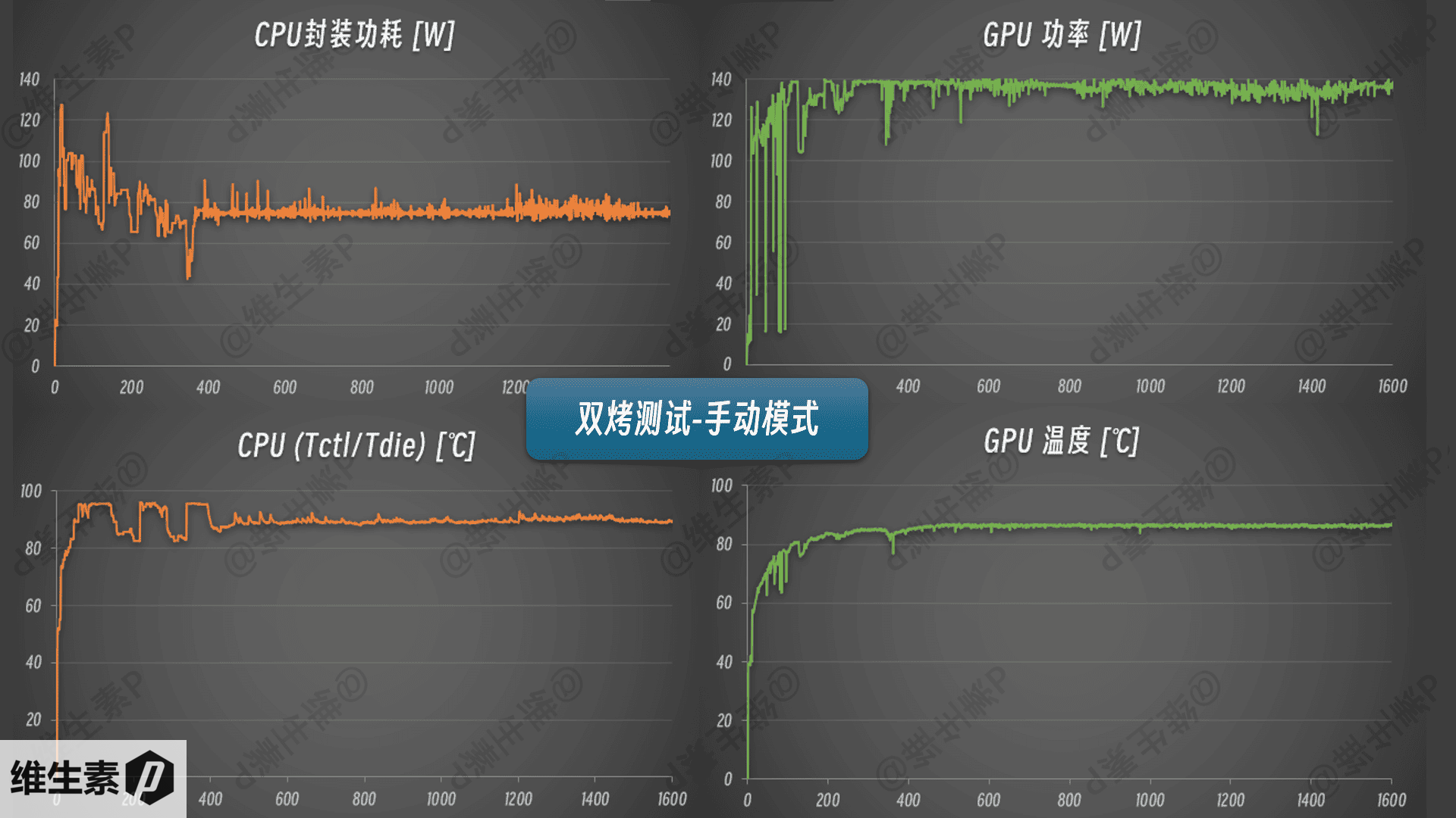 如果切换到手动模式拉满功耗设置,全程 10分钟 的跑分都可以维持在 140-130 W 的功耗区间,温度维持在 95 度,风噪会稍稍明显一些。这套散热模具的解热能力是相当给力了,而且键盘蛮清凉,风噪也还是属于可以接受的程度。