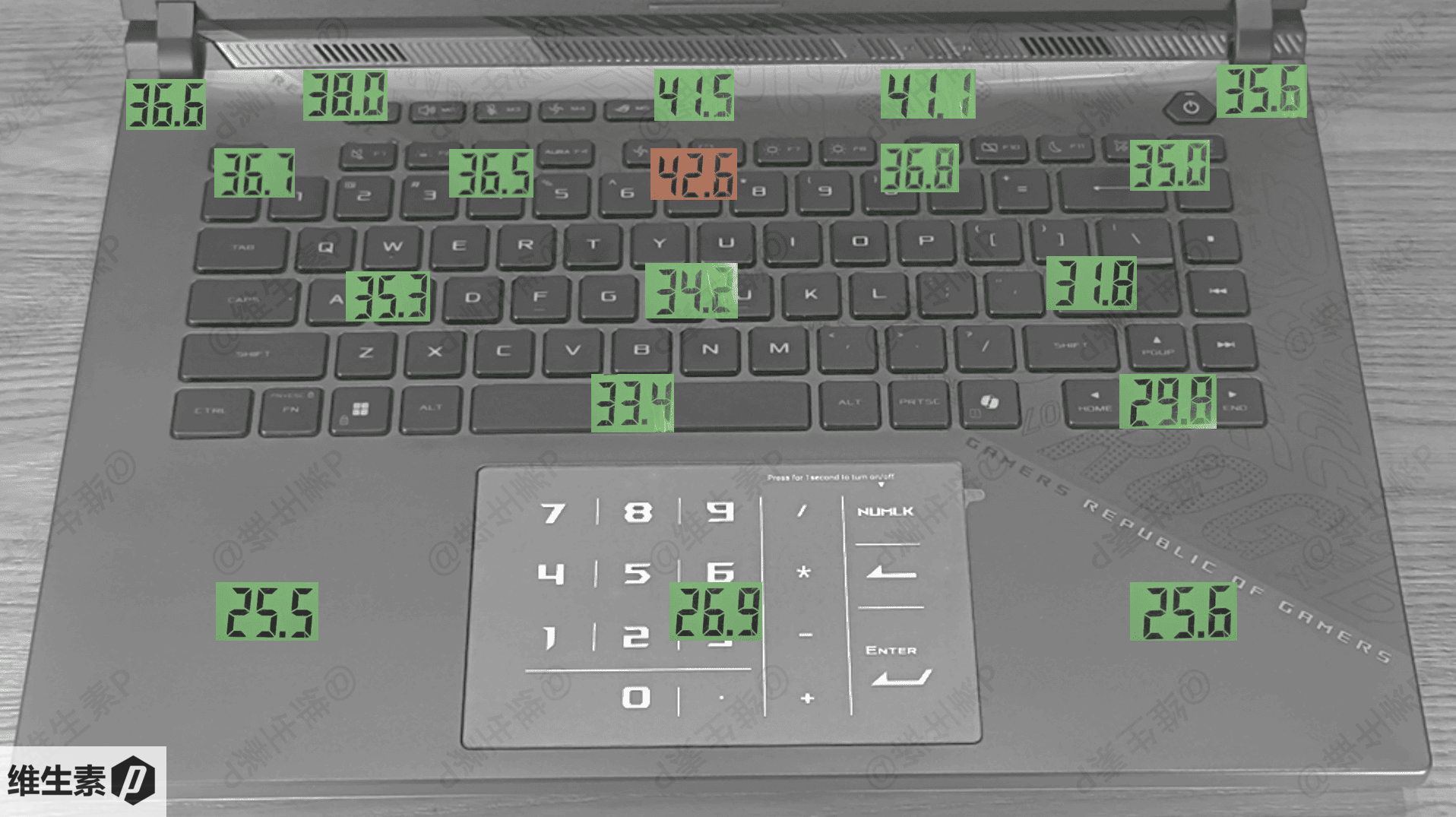 高负载双烤30分钟之后,使用红外温度计,测量键盘表面温度,得到的数据如下图所示。
