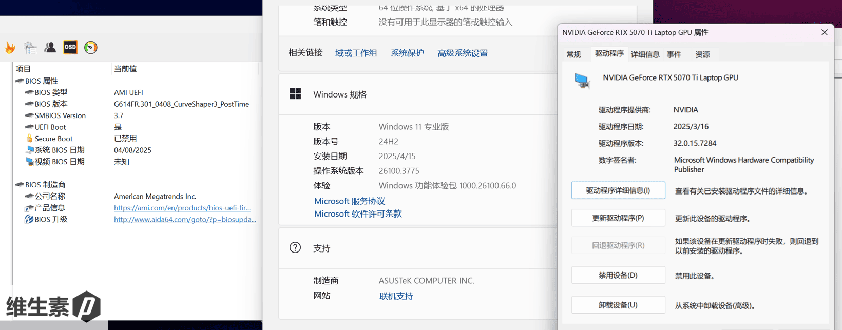 本次测评使用的是 Win11 24H2 版本,BIOS 版本号 G614FR301_0408,显卡驱动版本为 32.0.15.7284.