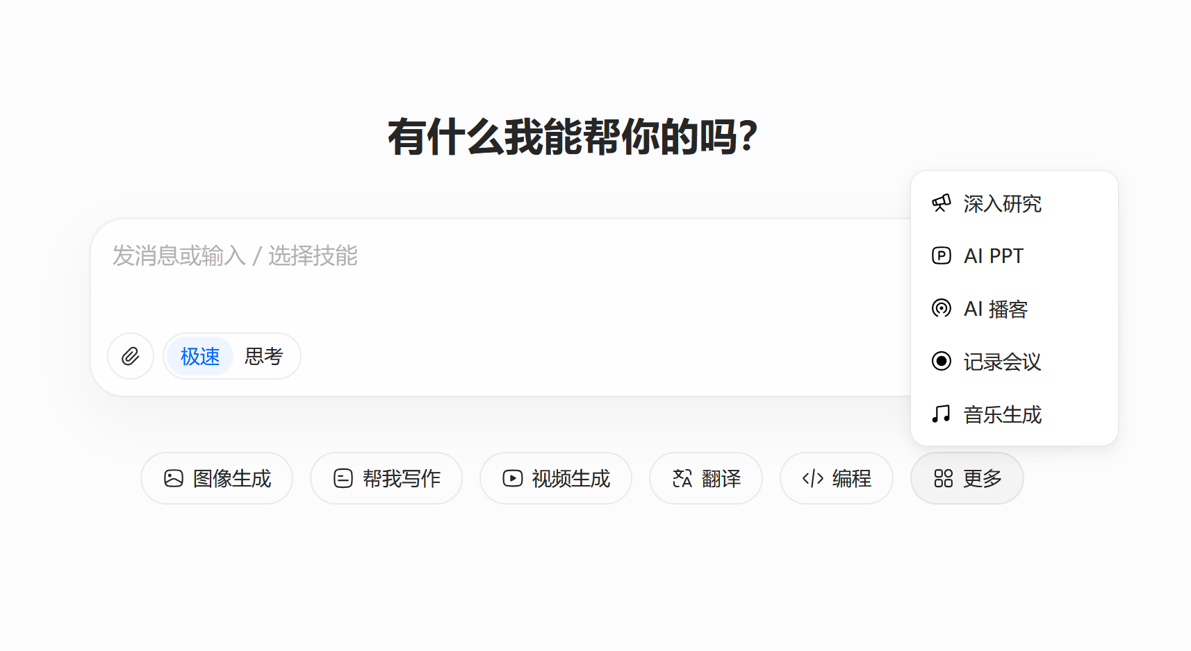 豆包才是中国国内应用功能最丰富的应用,也能看到他步步紧跟ChatGPT功能更新的步伐。深入研究、会议记录、支持code interpreter容器、编程接入了Trae,都是跟着ChatGPT模仿而来的功能,AI PPT属于国内特色,AI播客则是抄来了Google NotebookLM的功能。