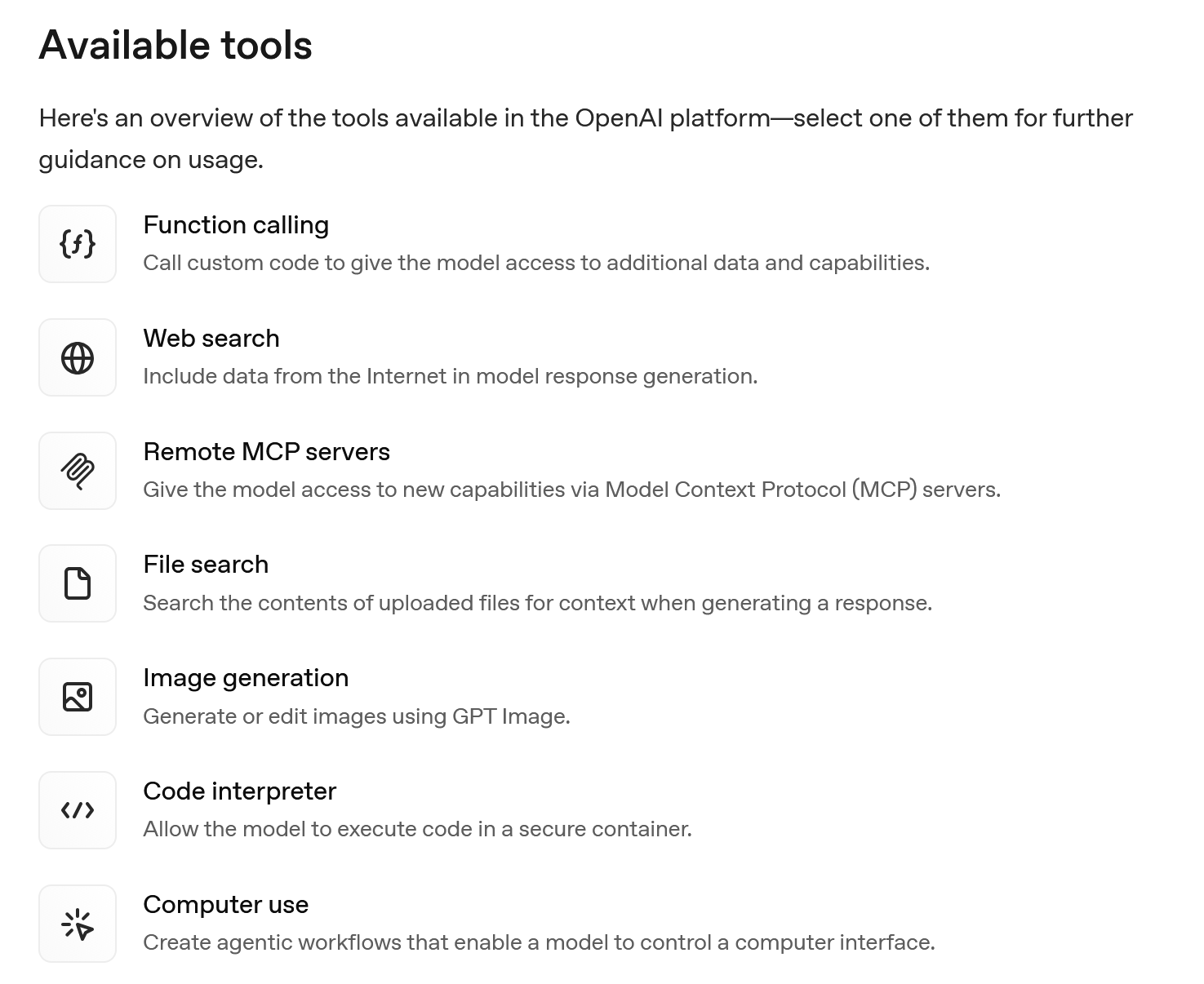 - OpenAI API平台里面直接开启web search,支持code interpreter在容器当中运行代码,支持文件搜索,支持自主连接MCP服务器。OpenAI都已经原生提供了丰富的工具,不需要开发者重复造轮子,对比中国国内没有几家云服务推理商支持web search API,支持容器代码运行,支持方便的文件搜索。