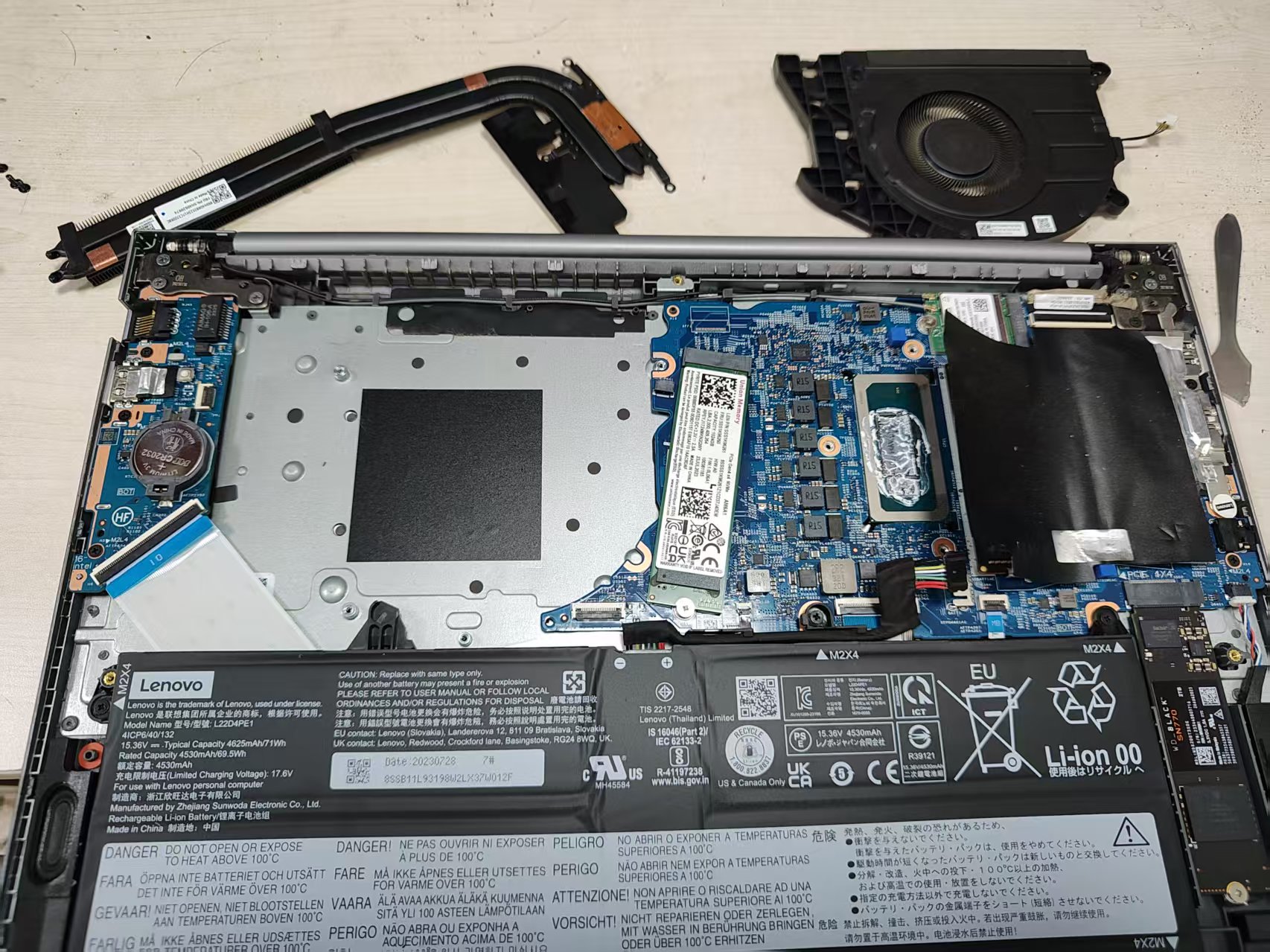 笔记本电脑换硅脂,需要拆机并取下散热模组后进行,需要卸下背板螺丝、电池断电等一系列操作。
