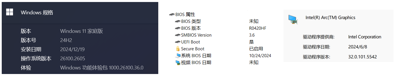 本次测评使用的是 Win11 家庭版 24H2 ,BIOS 版本号 R0420HF ,核显驱动版本为 32.0.101.5542.