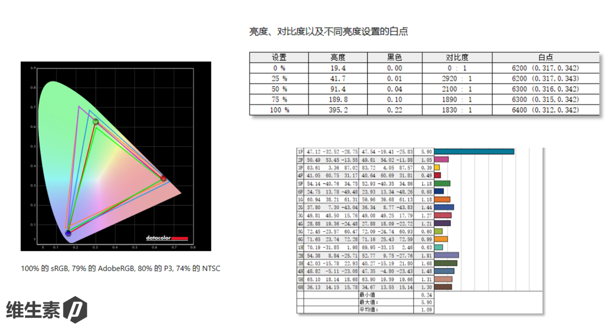 使用相关仪器测量,实测覆盖色域 100 %sRGB. , 80% P3 色域,79% 的 AdobeRGB 色域。色调响应曲线为 2.3。0%状态下亮度为 19 nit,50%亮度为 91 nit,100%亮度为 395 nit。最高亮度下,整体的平均色准 Delta E 为 1.09。从钴蓝色色准来看,猜测应该做了防蓝光但是没有花钱做认证。
