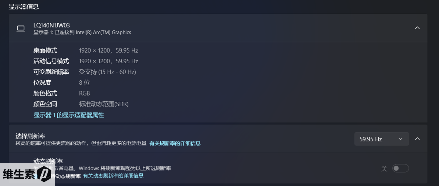 屏幕显示支持可变刷新率支持 15-60Hz,但是又在底下又写不支持动态刷新率,不知道是不是微软翻译的锅,可能这两个东西指的是不同的事情。