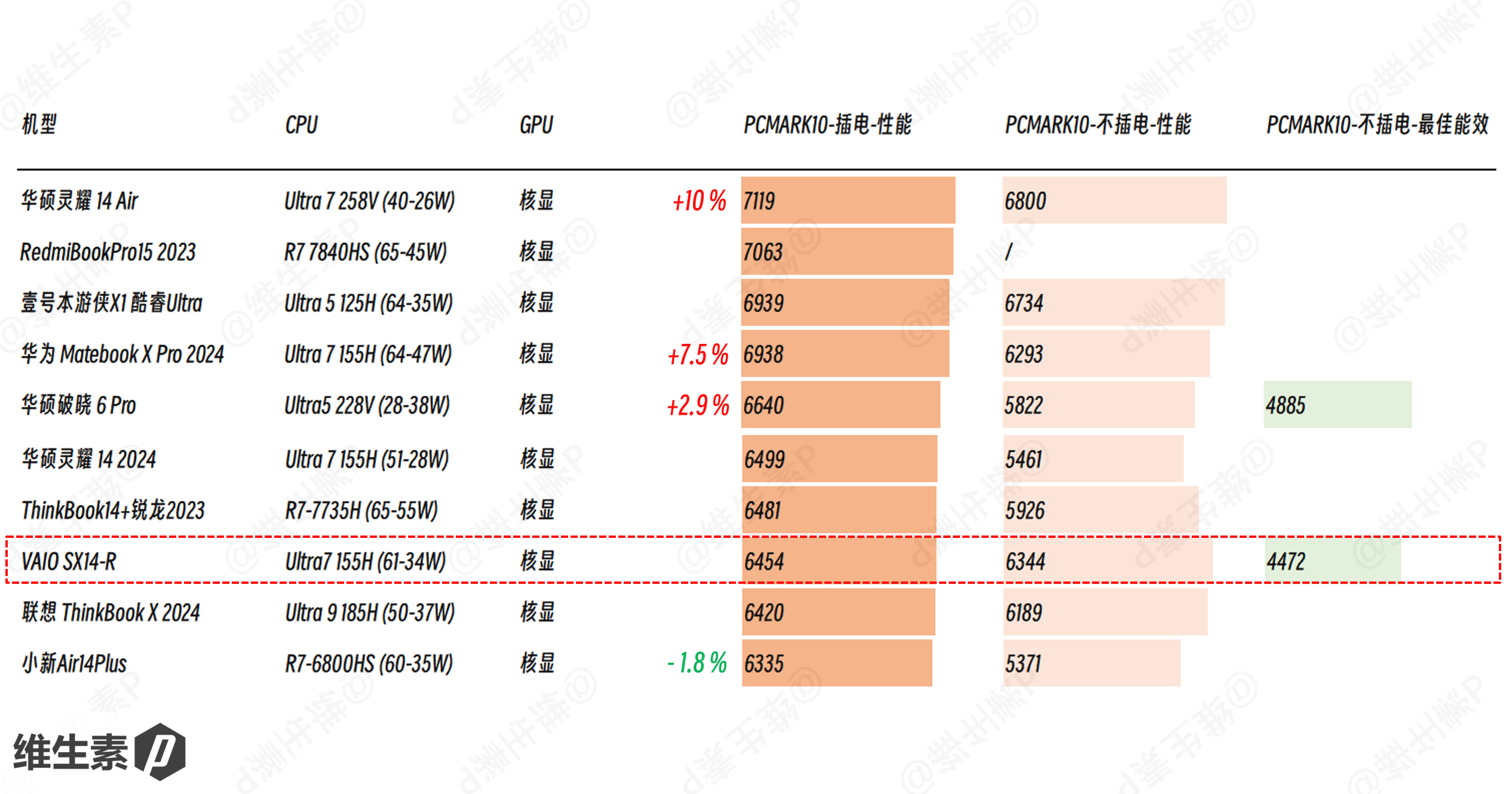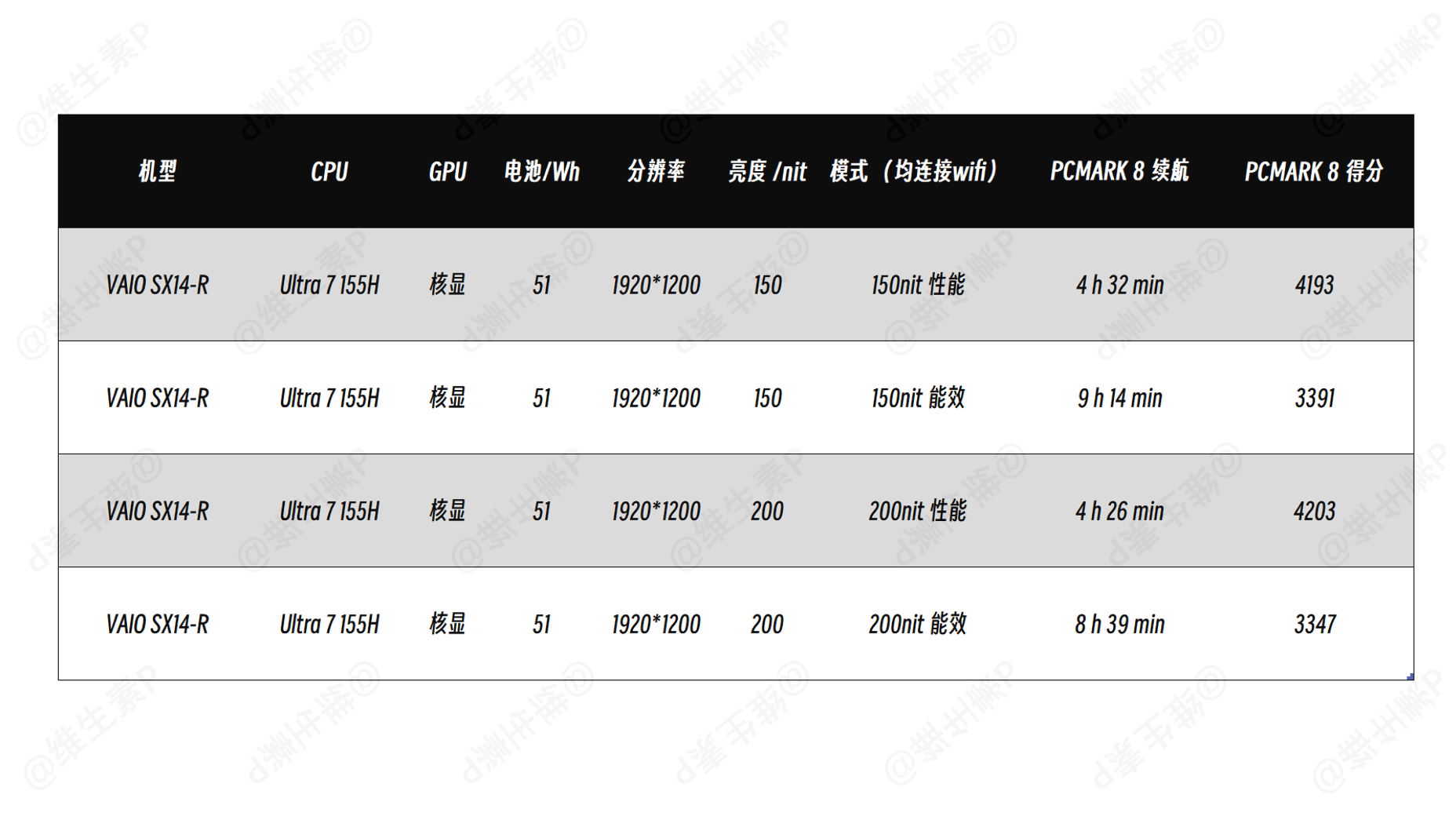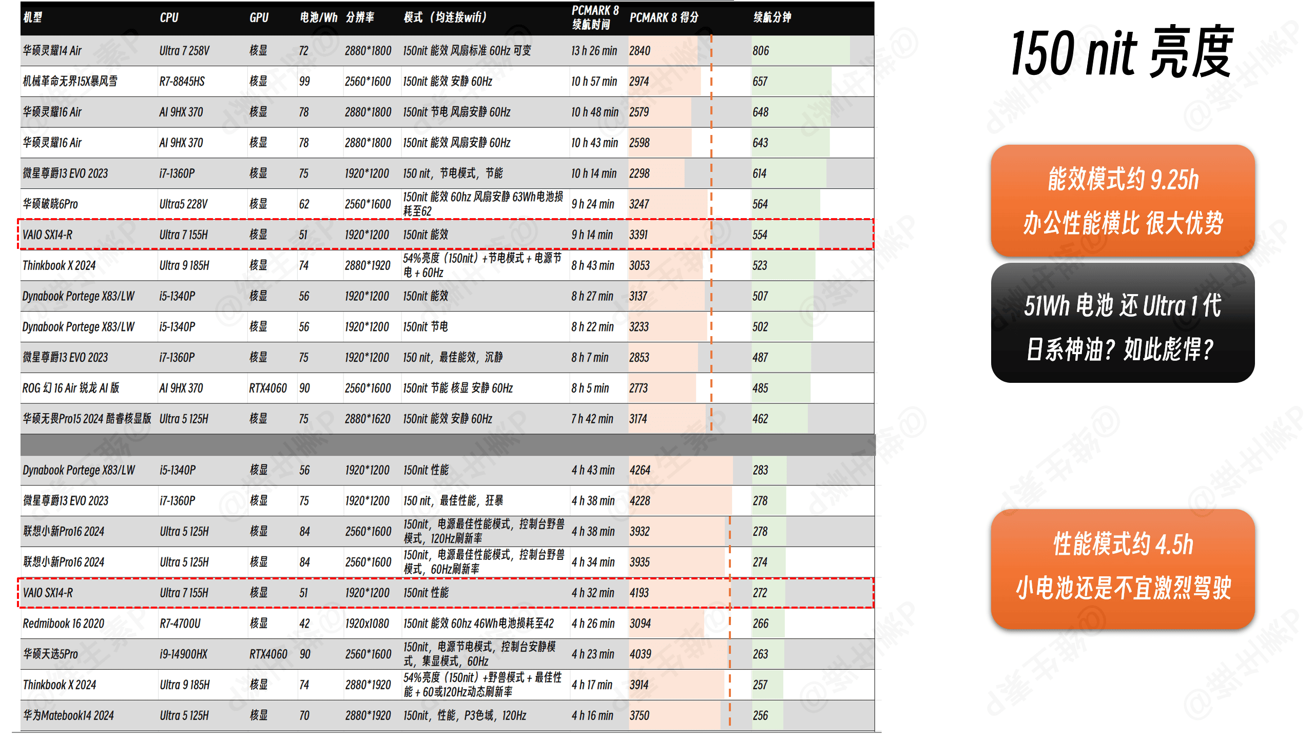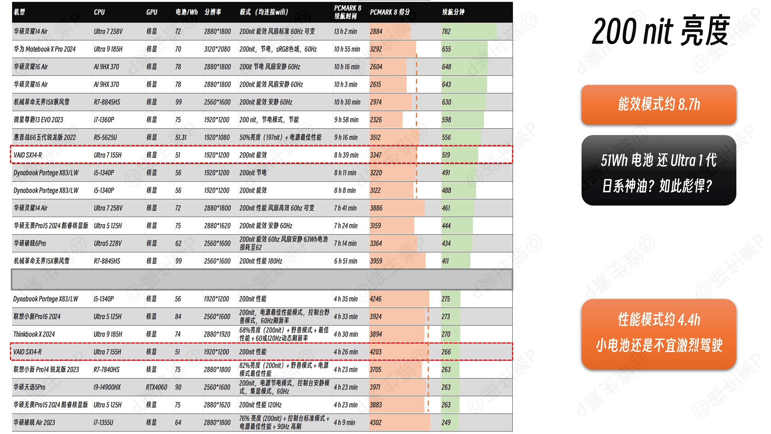 即使是已经有 Ultra200V 和 AI9 系列数据的影响下,VAIO SX14-R 依旧跑在了趋势线之上,相比于过去往年的轻薄本要好的多,51Wh 电池带着Ultra1代就能跑出这种能效,其实也不错了。