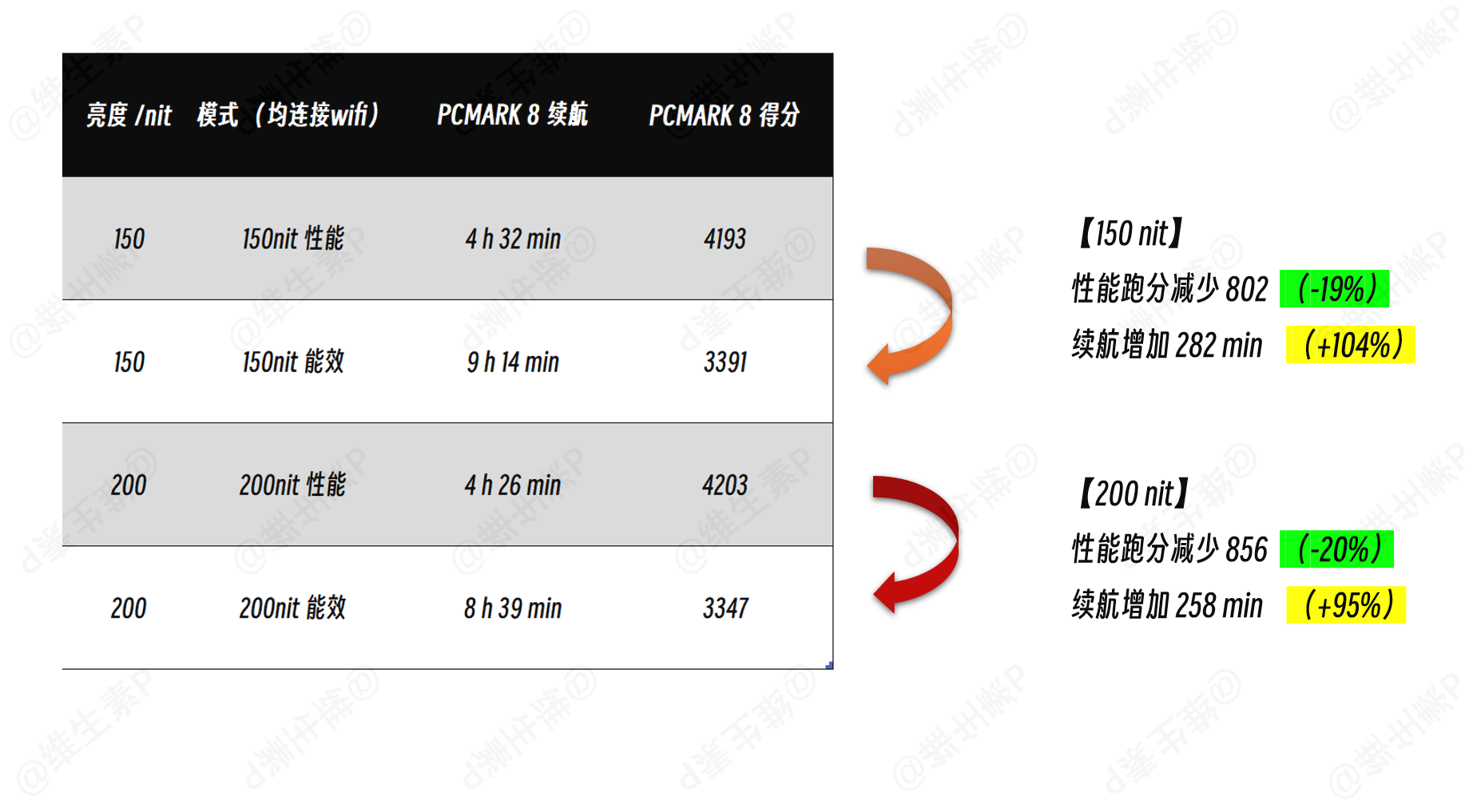 在普通 150 – 200 nit 亮度下,屏幕亮度对续航的影响并不显著。