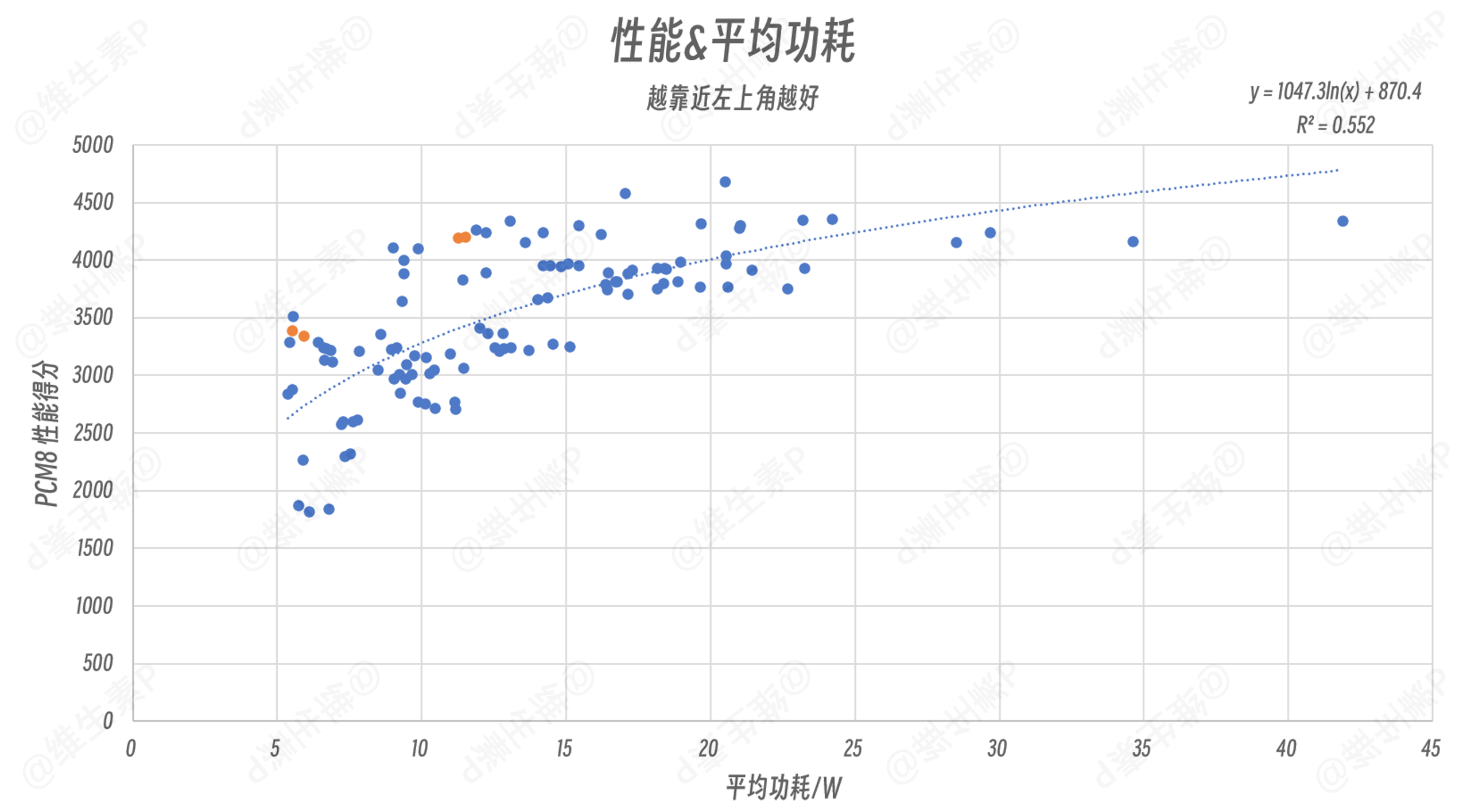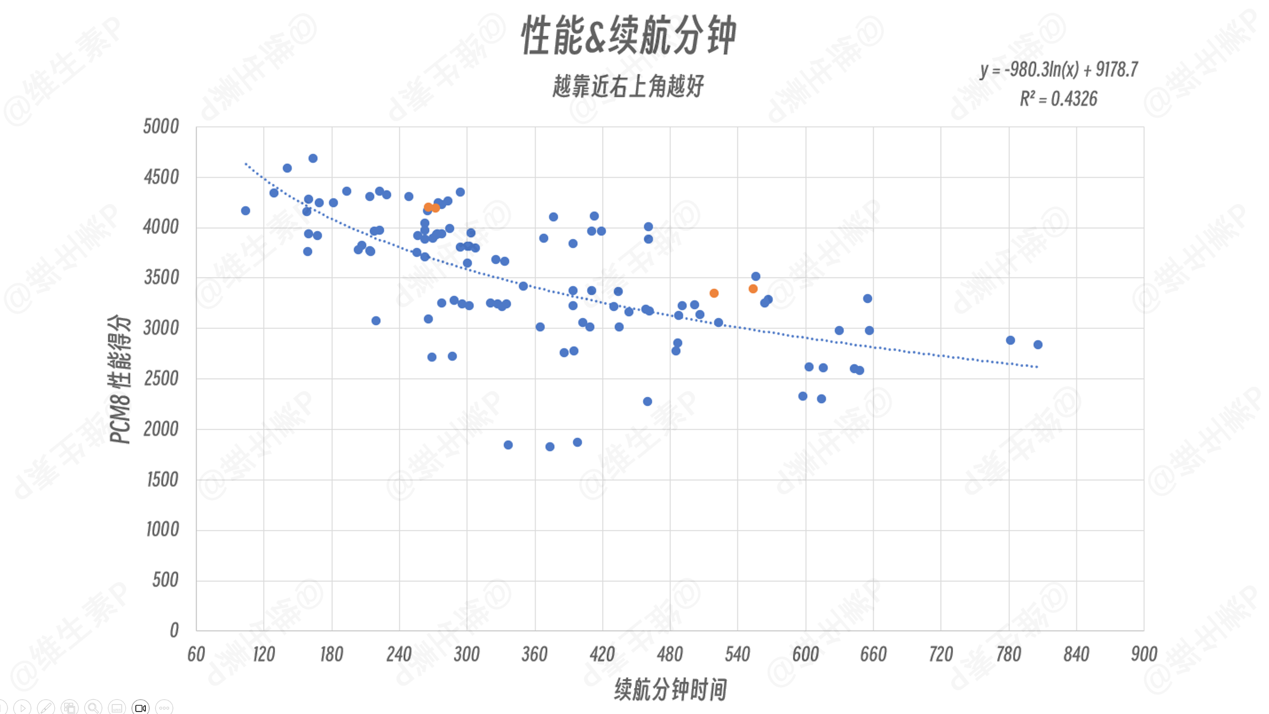 参考办公能效横比,下面的散点图中用橙色标记出了 VAIO SX14-R 的数据结果。