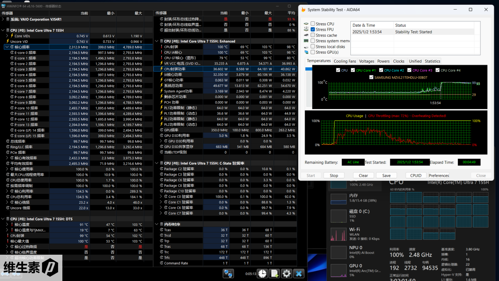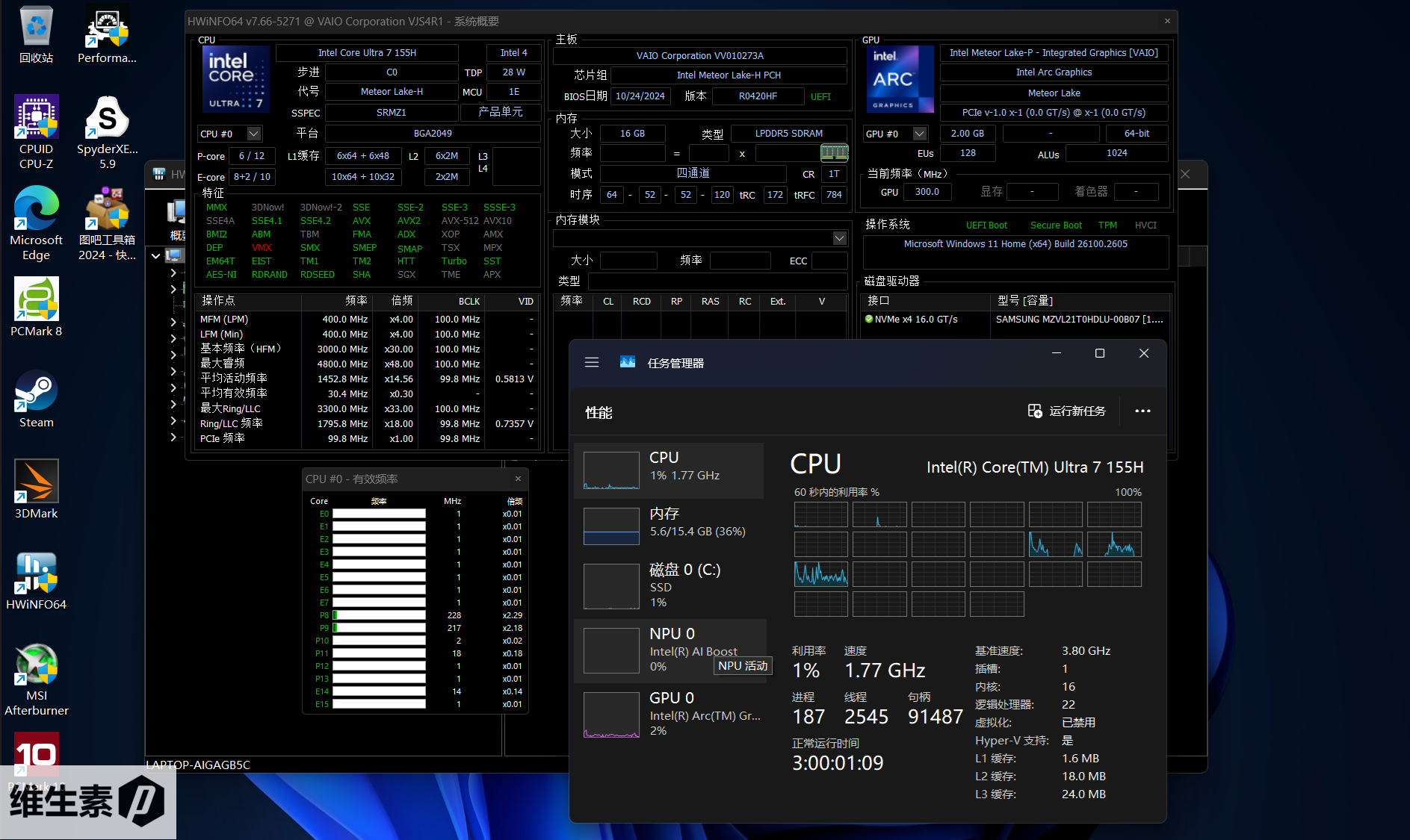 测评的这台 VAIO SX14-R 的 CPU 是酷睿 Ultra1 代 Meteor Lake 的 Ultra7-155H,采用了三阶调度,有 6 个性能核,8 个能效核,以及驻留在 Soc tile 的 2 个低功耗能效核,总计 16 核心 22 线程