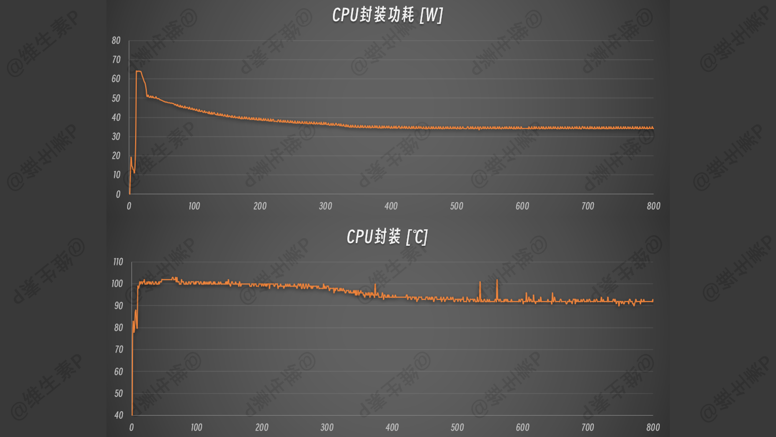 收集30分钟时间的系统数据,如下图所示,单烤的功耗,一开始就推上最高 65 W,随后逐步回落到 50W,再缓慢逐步降低至 34 W。