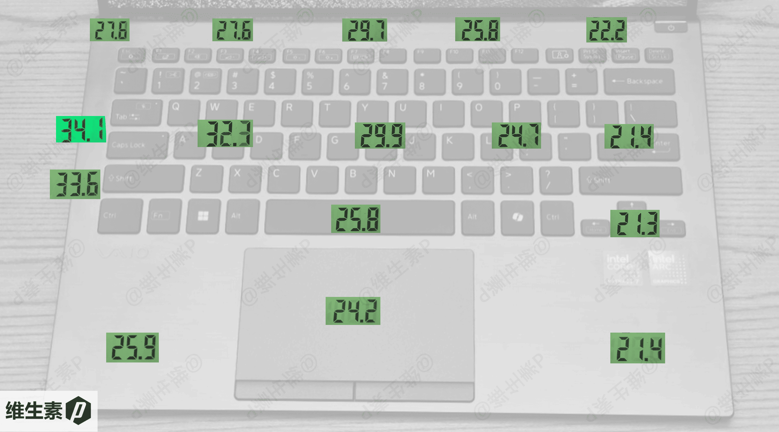 高负载双烤30分钟之后,使用红外温度计,测量键盘表面温度,得到的数据如下图所示。