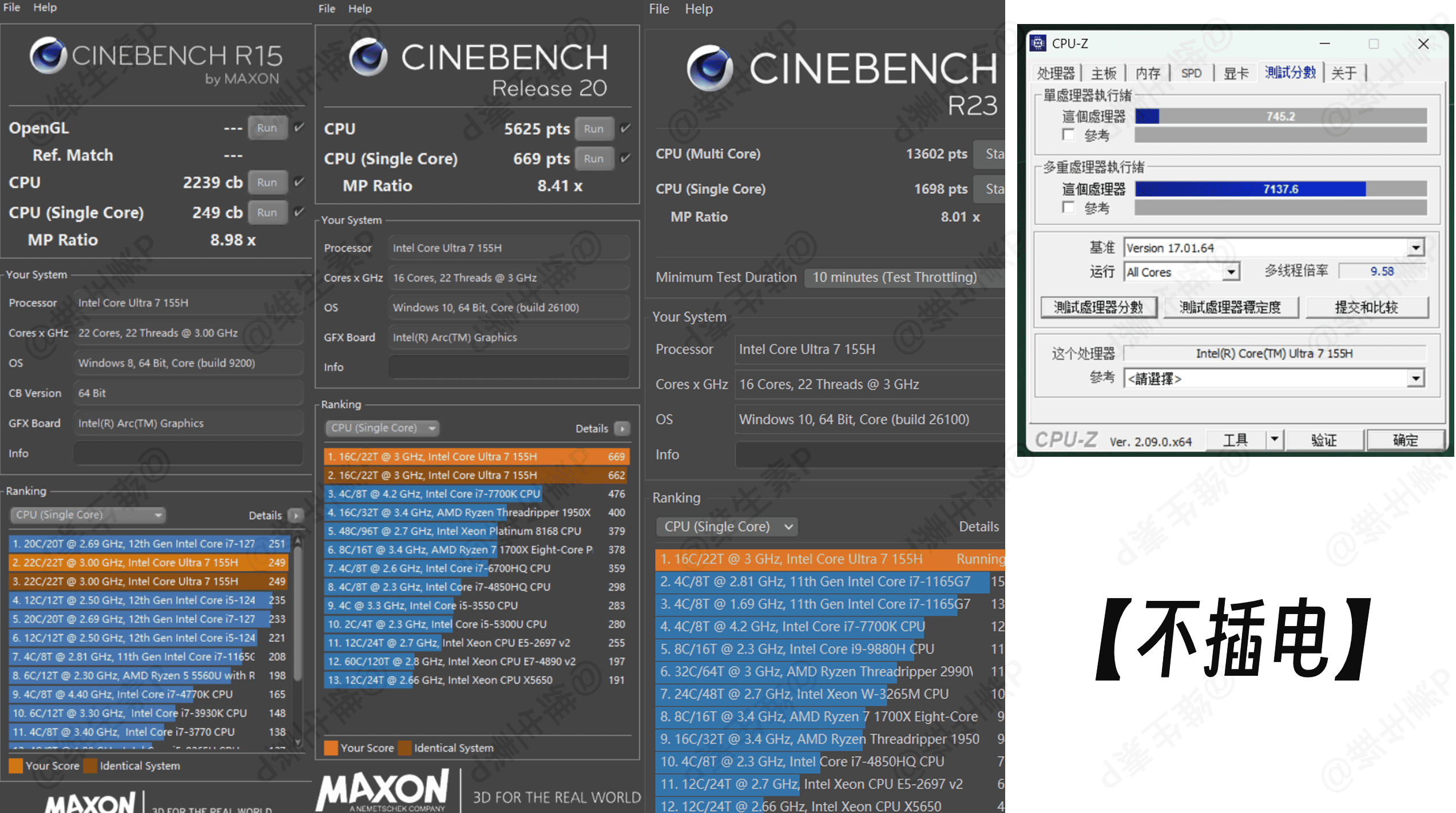 在不插电开启最强性能的情况下,各项目跑分有微微下降 9 – 14%左右,但是 R23 10分钟模式跑分反而上升了微微一点点,估计是因为跑 10 分钟模式顶功耗墙了,所以没有显著离电差异。
