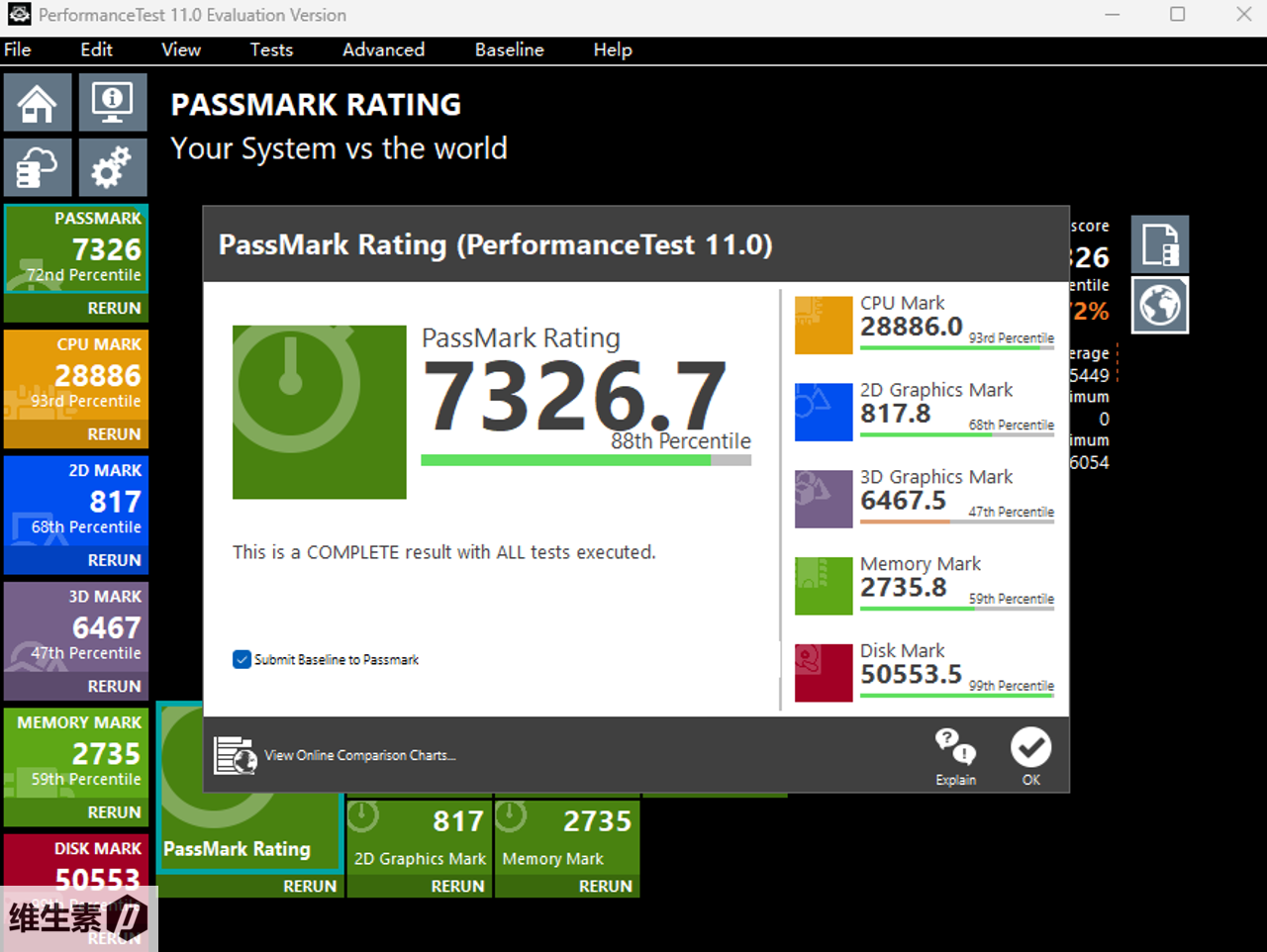 PassMark 跑分如图,总分 7326.7,CPU 是 28886 分,非常吉利,3D 图像分 6468 分。