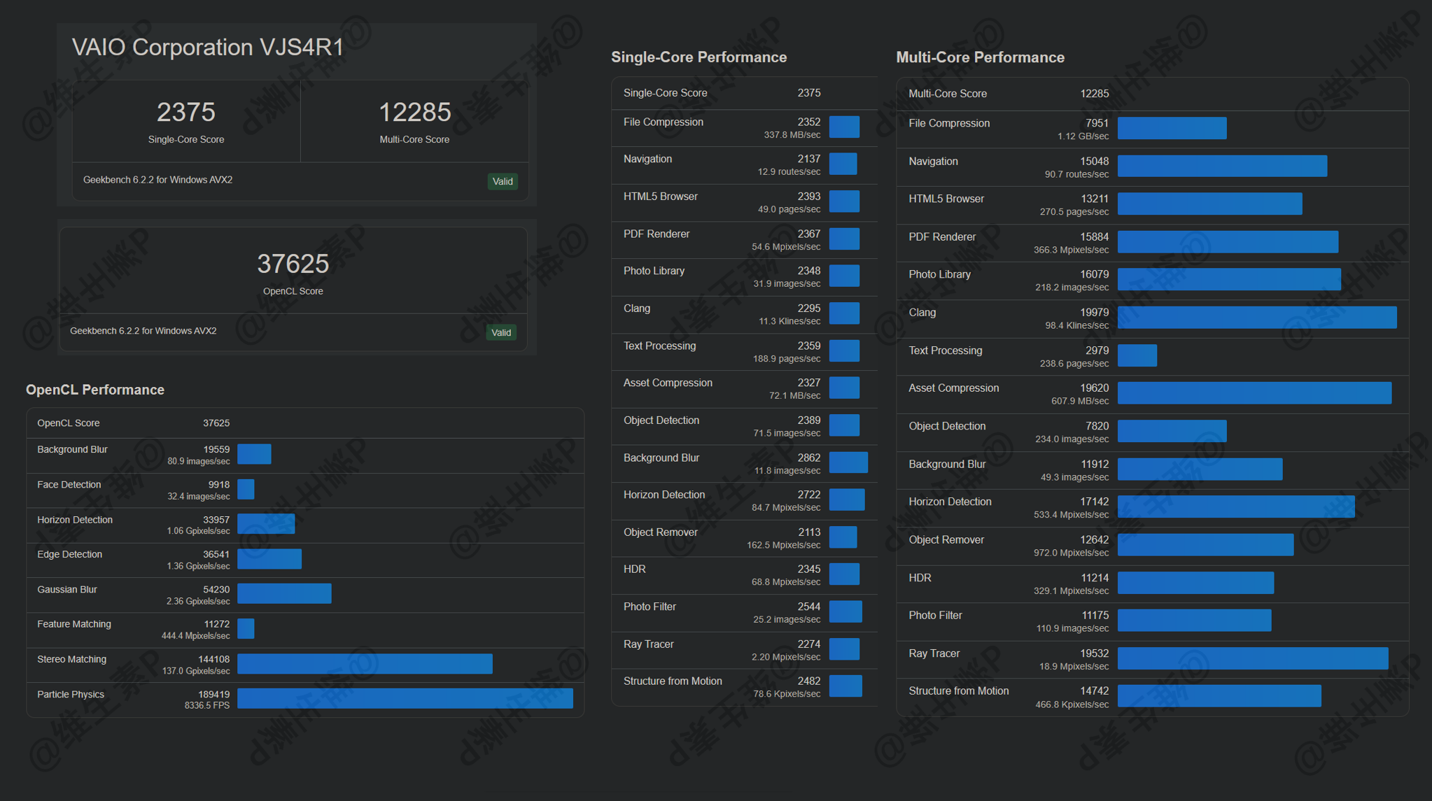 VAIO SX14-R 的 CPU 单核得分 2375 分,多核得分 12285 分,核显的 OpenCL 跑分数据为 37625 分。