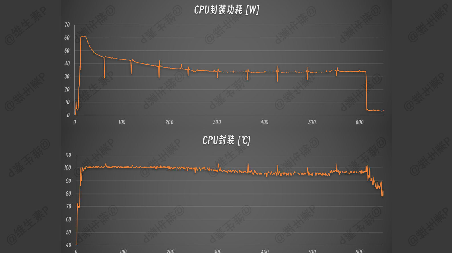 R23 10分钟模式的跑分过程,功耗表现如下,峰值功耗比单烤低一点点,维持在 61-34W 的状态。