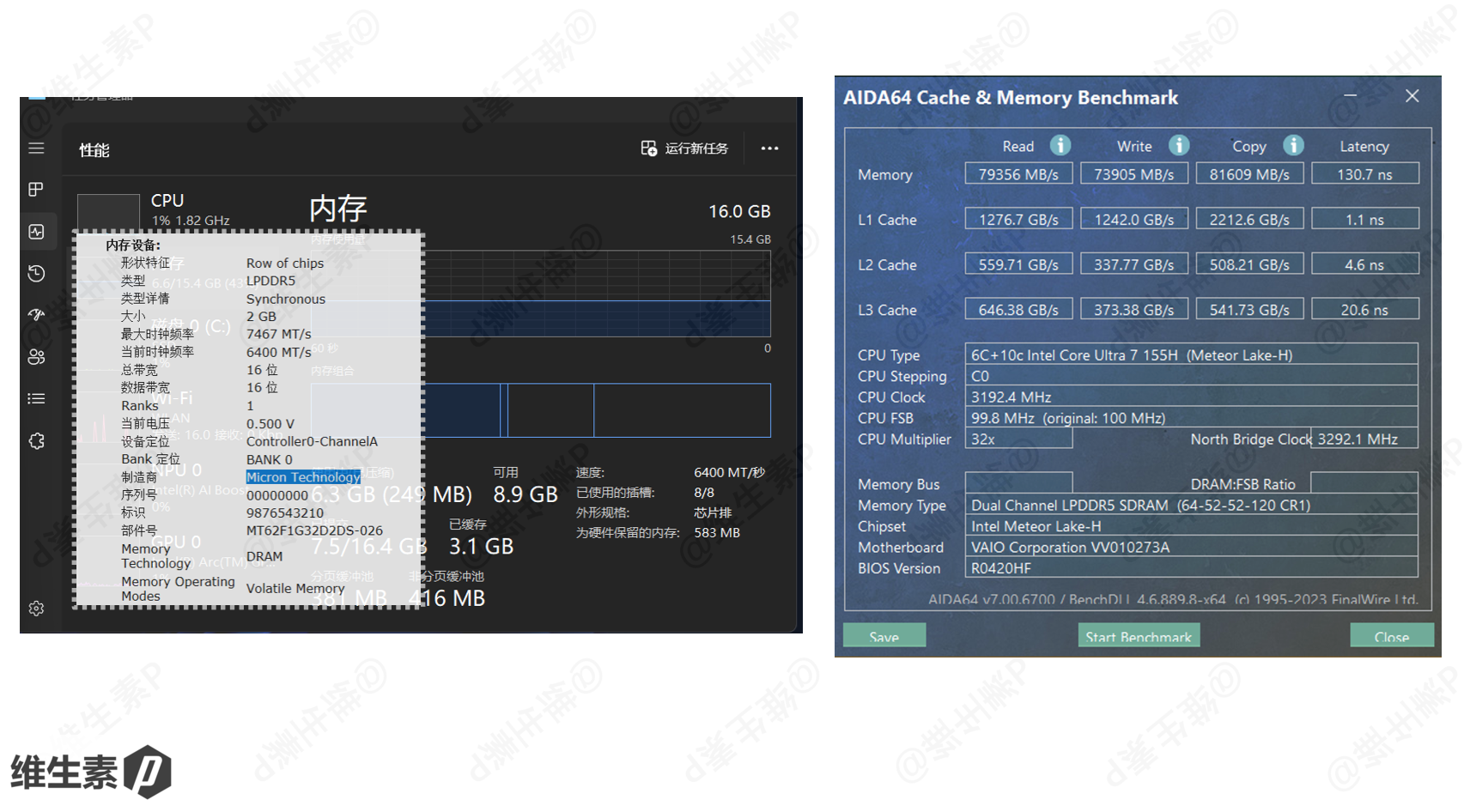 VAIO SX14-R 内存是 LPDDR5-6400 MT/s 板载的 16G 内存,跑分数据如下图所示,读写速度还可以,内存延时达到了 130.7 ns。
