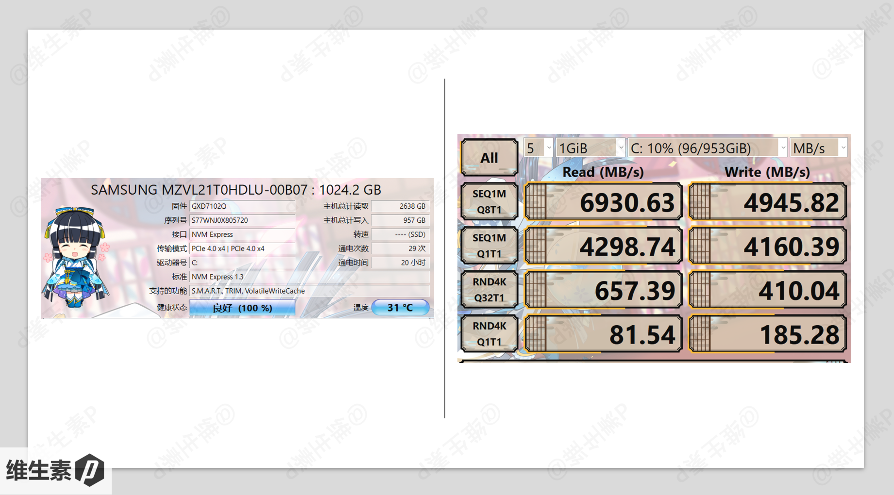 M2 固态硬盘来自三星,PCIe 4.0 × 4,容量1T,型号为 MZVL21T0HDLU-00B07,也就是知名的三星 PM9A1a 固态,读写相关测试如下图所示。