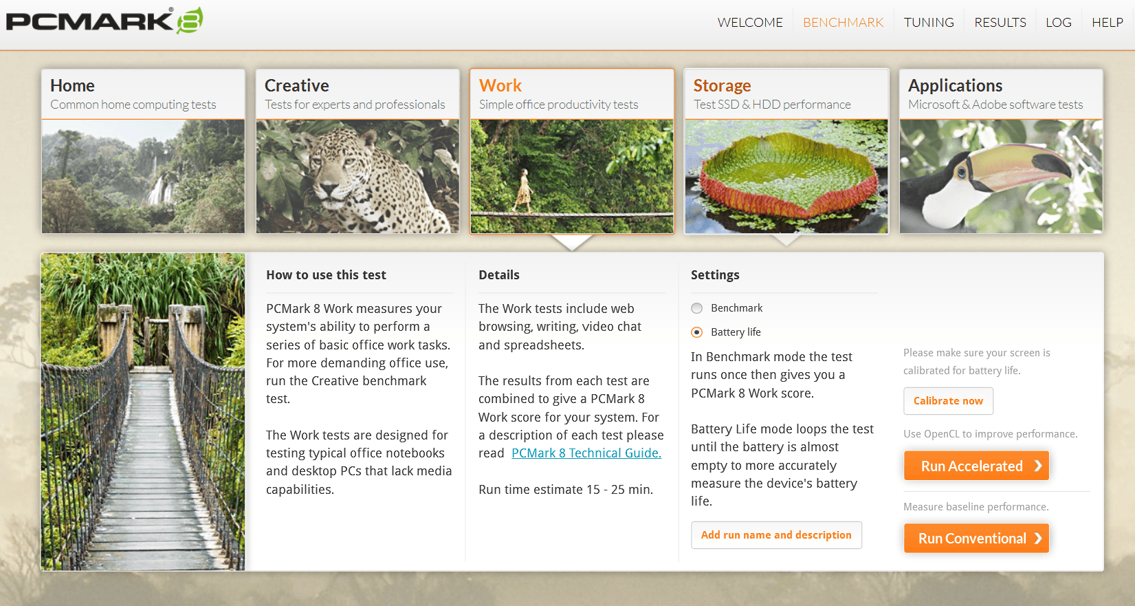 这里使用 PCMARK 8 的 Work 模式,进行简单 office 轻度生产力办公的模拟运行,包含网页浏览,文字写作,视频通话,excel 数据处理等常见轻度办公场景,从满电一直连续运行直到消耗 80% 电量之后,进行续航的数据评估,并且给出性能得分。