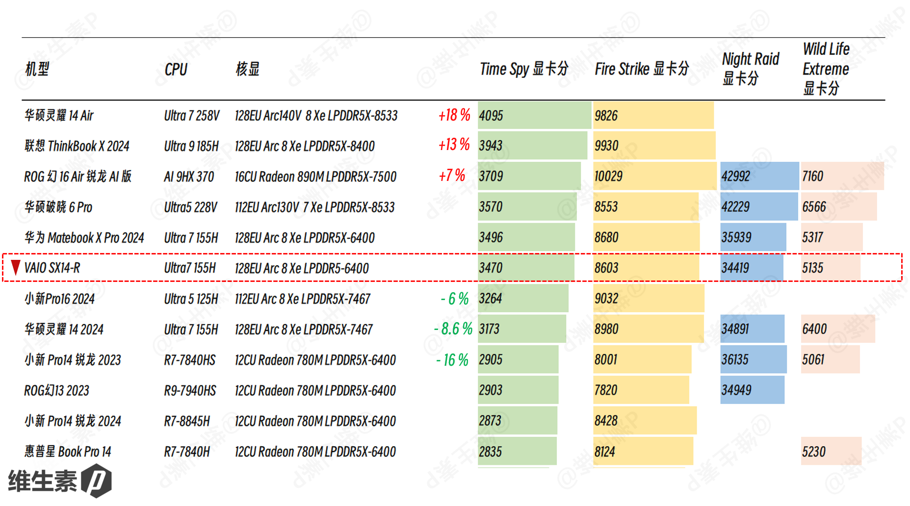 3DMark 跑分的横评对比来看,和新款的配置还是有一些差距,不过 U7 核显比 U5,以及其他更弱性能释放的机型强一些。