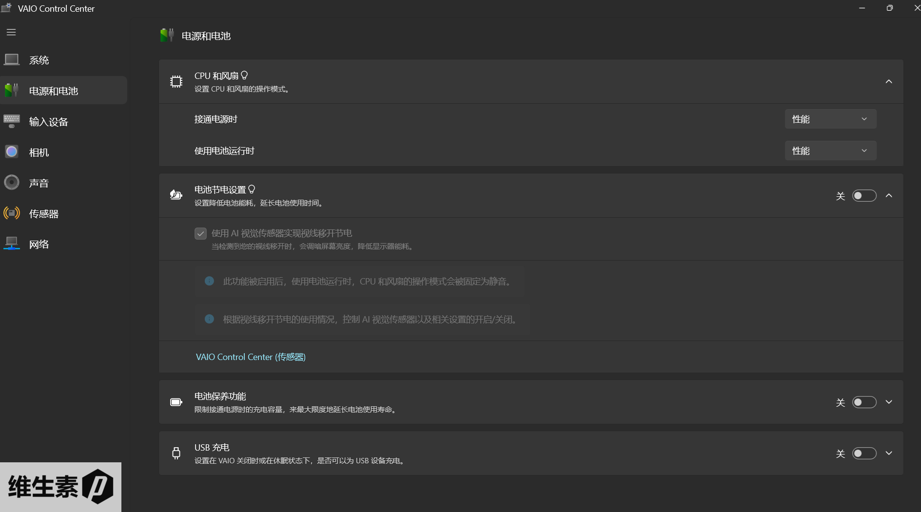 在使用体验交互上,VAIO 内置了一个非常简约,和 Win 风格接近的 VAIO Control Center,可以根据商务场景去设置一些功能,也可以控制电源模式,基于Win电源自带的性能模式切换,还有人脸识别相关的控制。