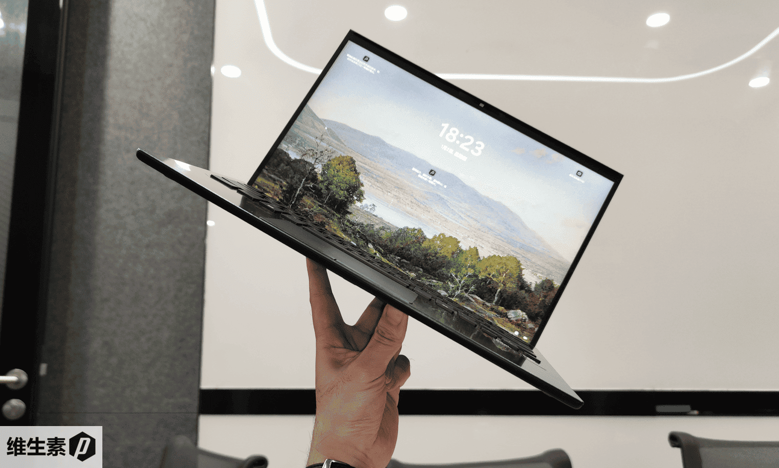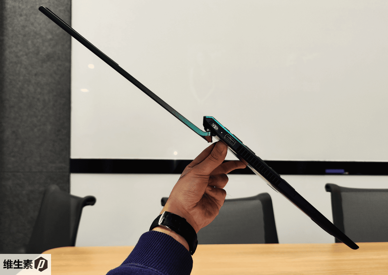 由于低配 51 Wh 版本重量不足1kg,所以拉开 180 度之后,只需三根手指,就可以支撑起这整台机器,独属于超轻量笔记本的飞行机动快乐。
